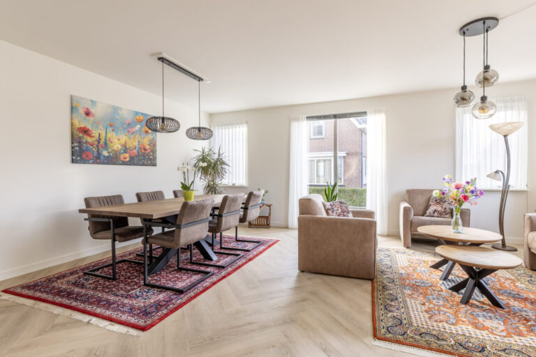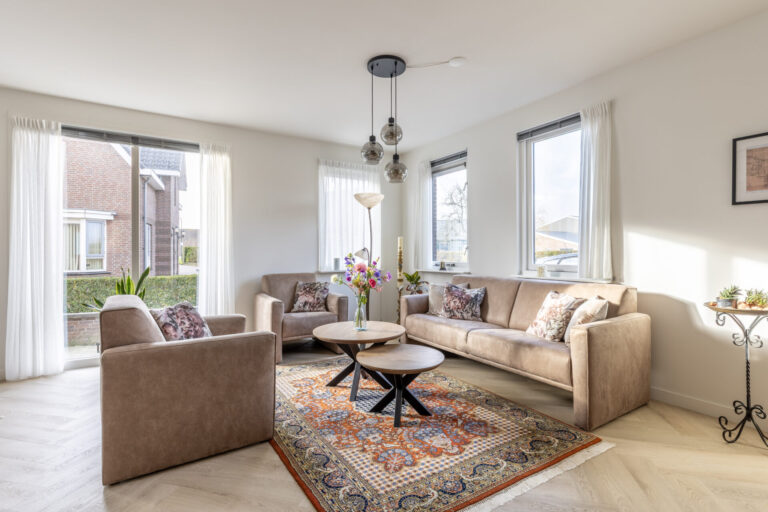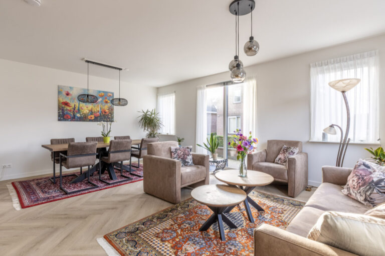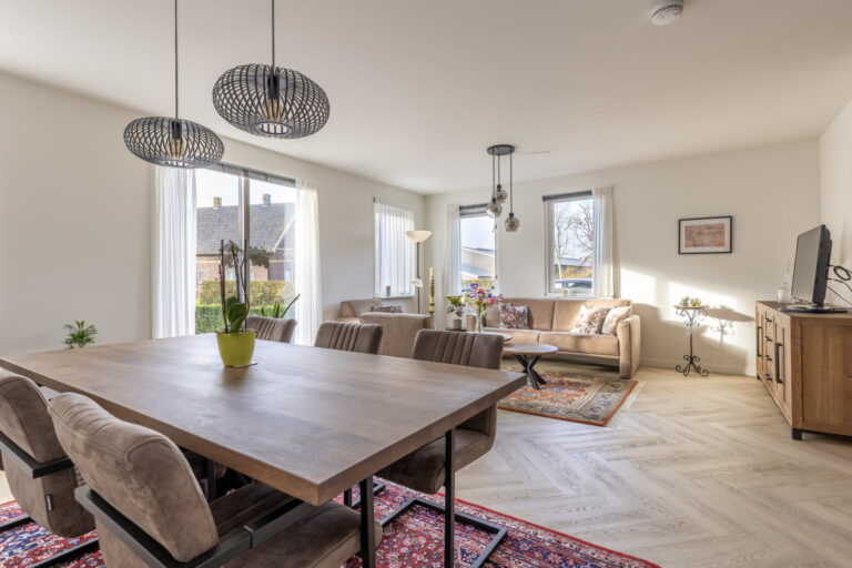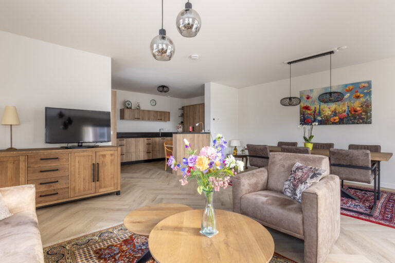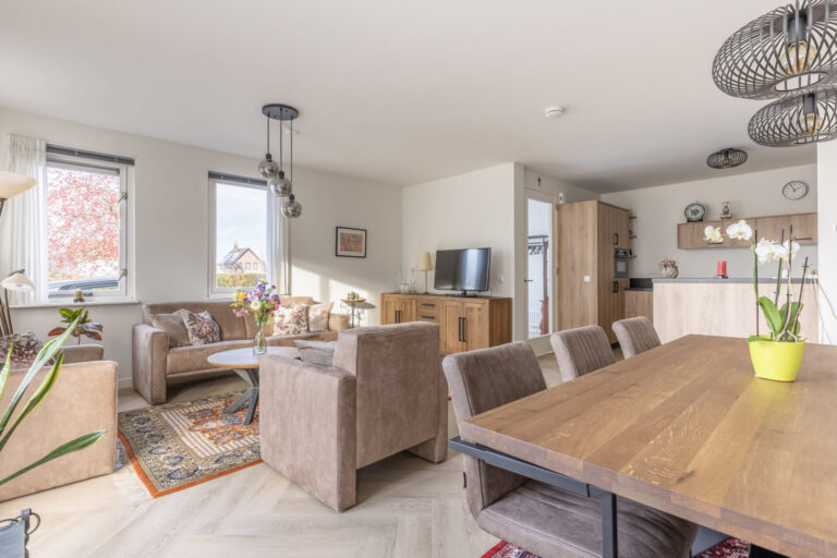 De entree biedt toegang tot de lichte woonkamer met zit- en eethoek en aangrenzende open keuken.