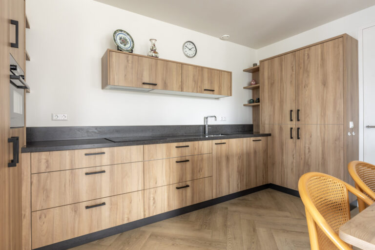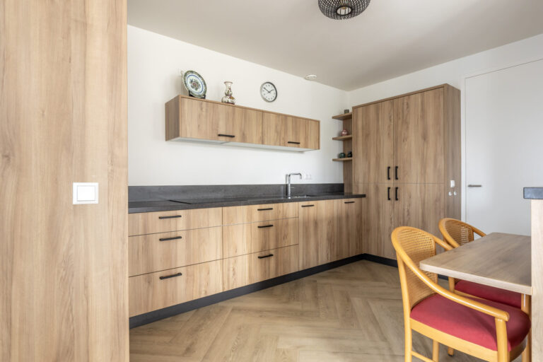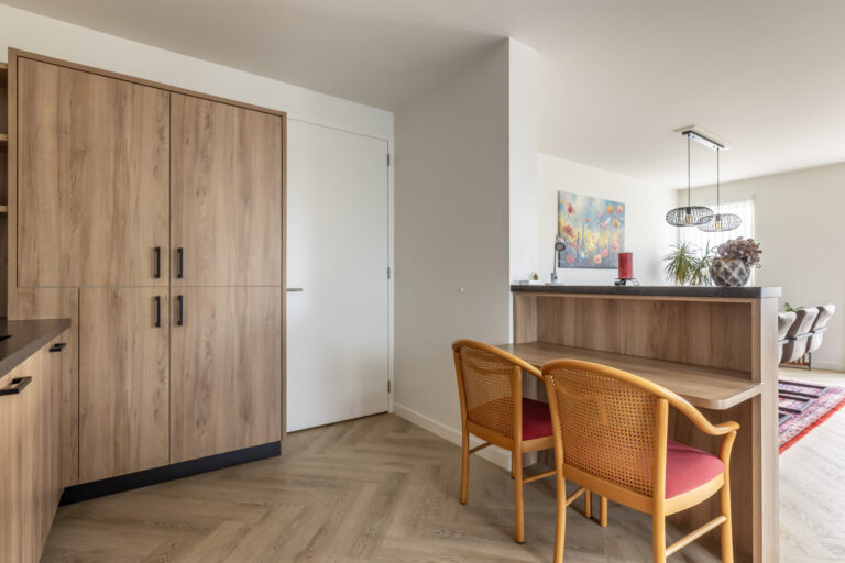 De moderne keuken beschikt over een spoelbak, een Quooker-kraan, een vaatwasser, een inductie-kookplaat, een afzuigkap, een combi en een koelkast. Daarnaast is er een fijne eetgelegenheid in de keuken gerealiseerd.