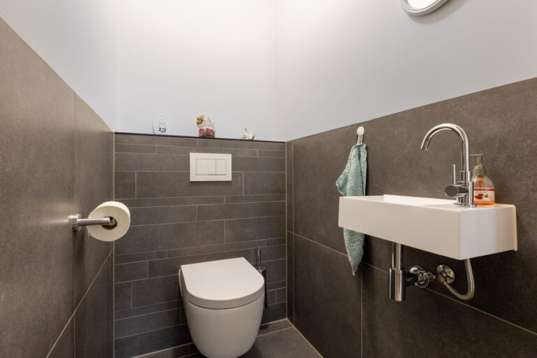 Naast de masterbedroom is de badkamer met een inloopdouche en wastafelmeubel gesitueerd. Er is een losse toiletruimte met een fonteintje aanwezig.