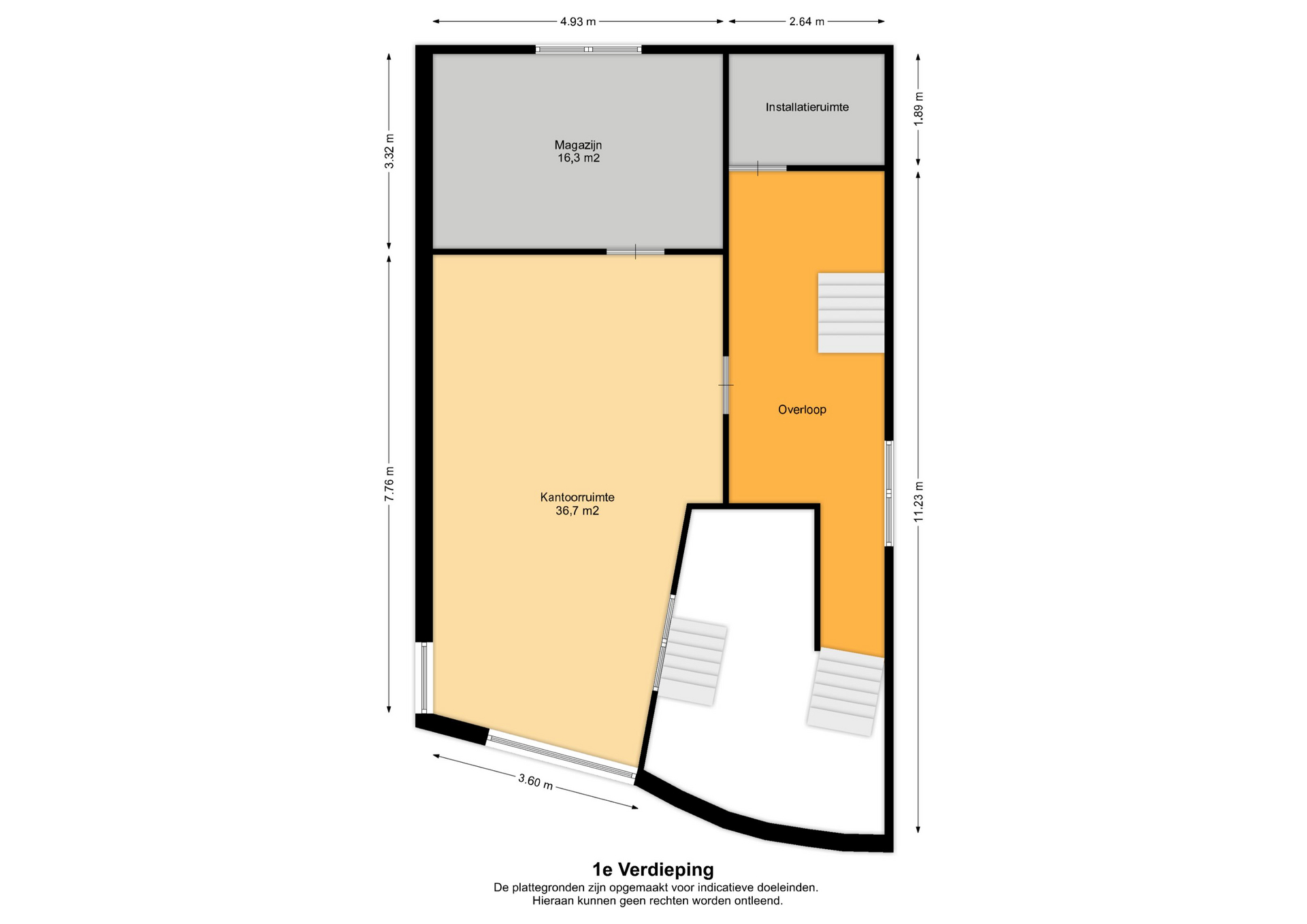 Op de eerste verdieping bevindt zich een kantoorruimte van circa 36,7 vierkante meter. Via deze ruimte is het magazijn met een oppervlakte van circa 16,3 vierkante meter te bereiken. Op deze verdieping bevindt zich tevens de installatieruimte.