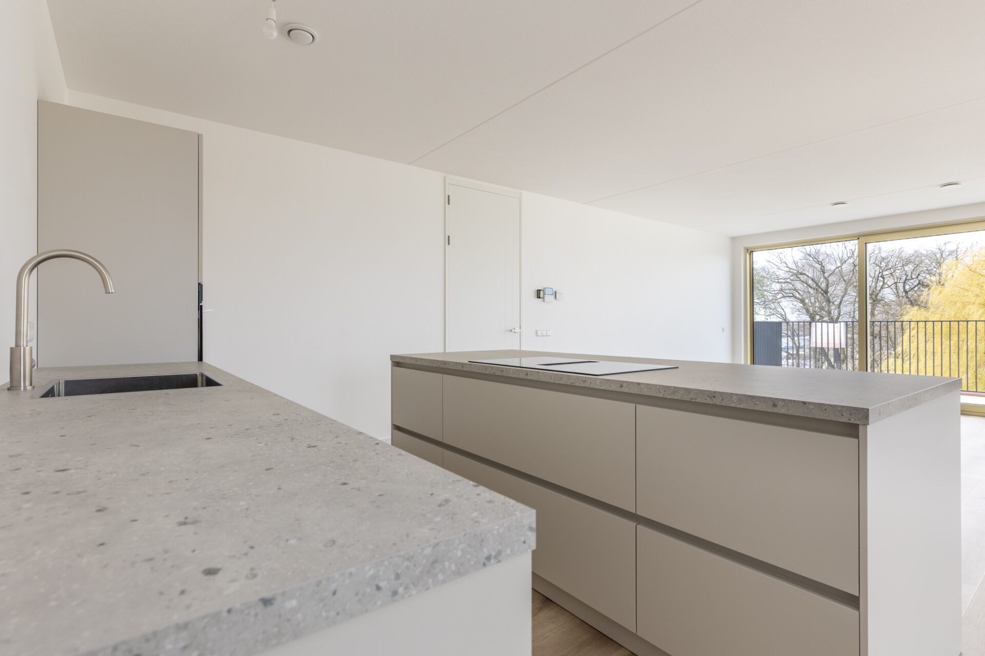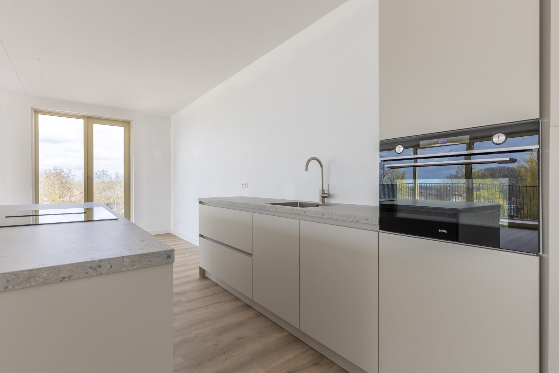 Via de hal bereikt men de lichte woonkamer met open keuken en kookeiland. Dankzij de grote schuifpui over de volledige breedte van de woonkamer beschikt deze ruimte over veel natuurlijk lichtinval! De woonkamer biedt voldoende ruimte voor een riante zithoek en een eethoek. De nieuwgeplaatste keuken met kookeiland is voorzien van een spoelbak, een vaatwasser, een inductiekookplaat met geïntegreerde afzuiging, een combimagnetron en een koel-vriescombinatie.