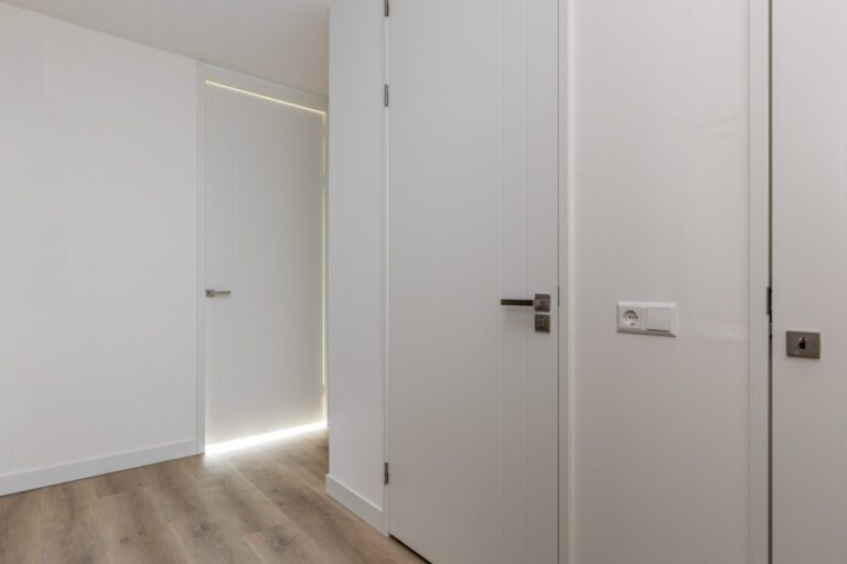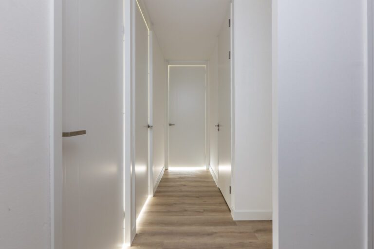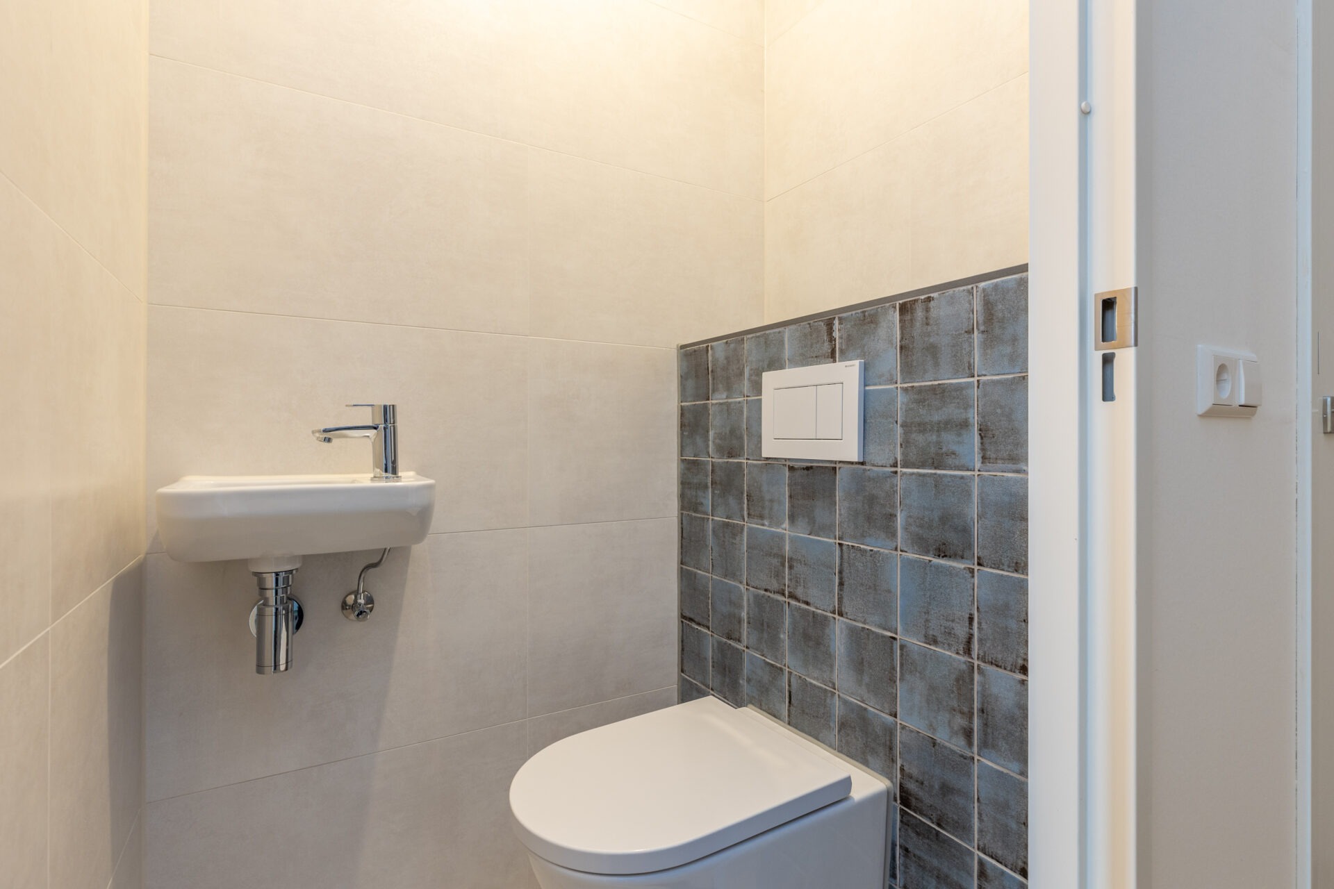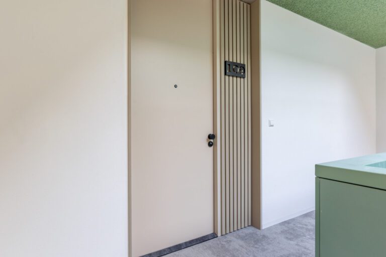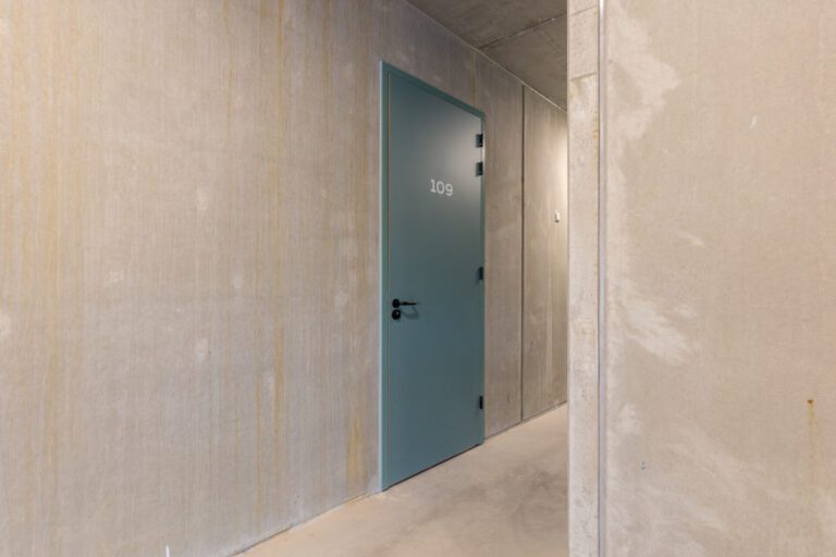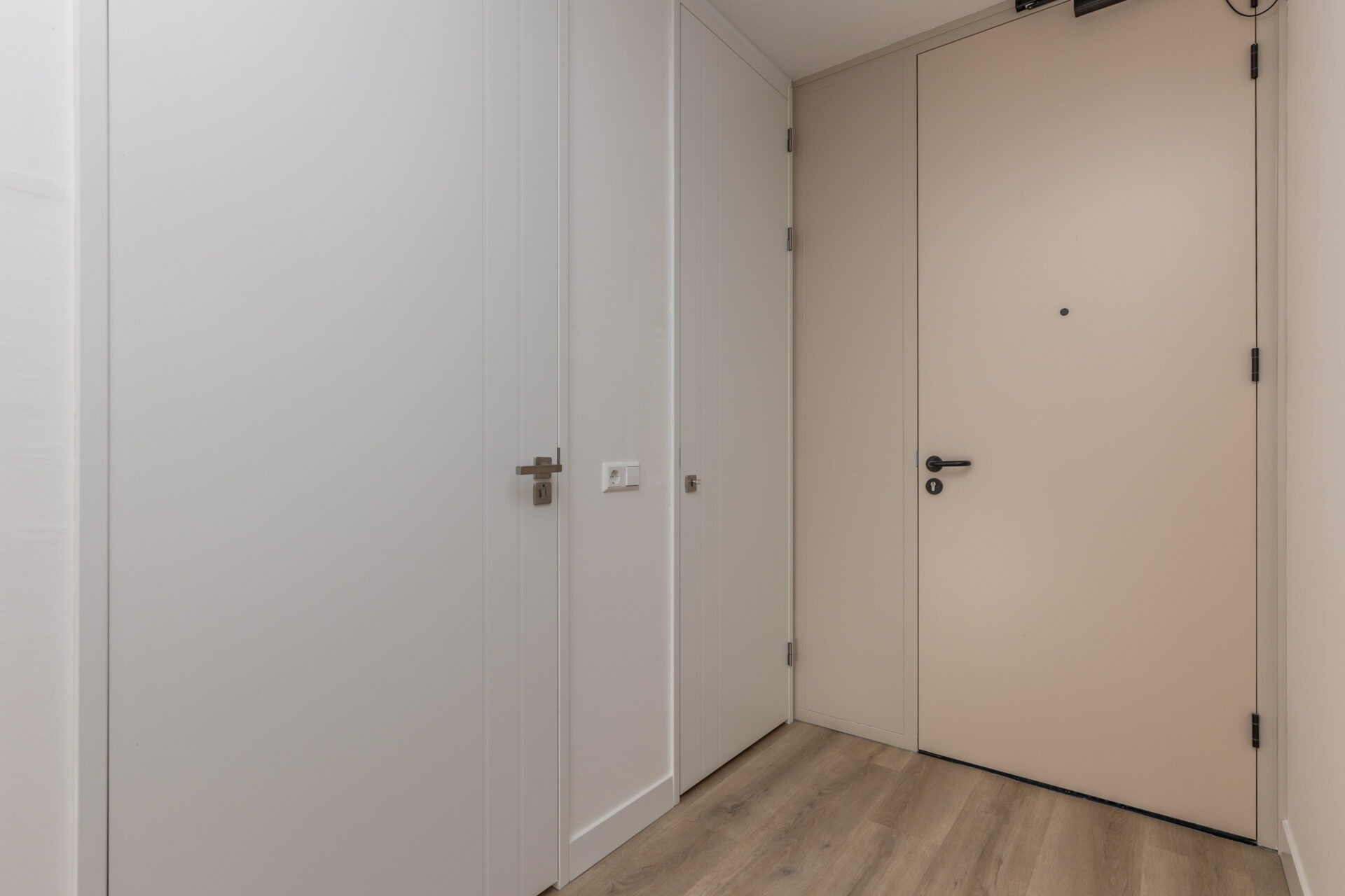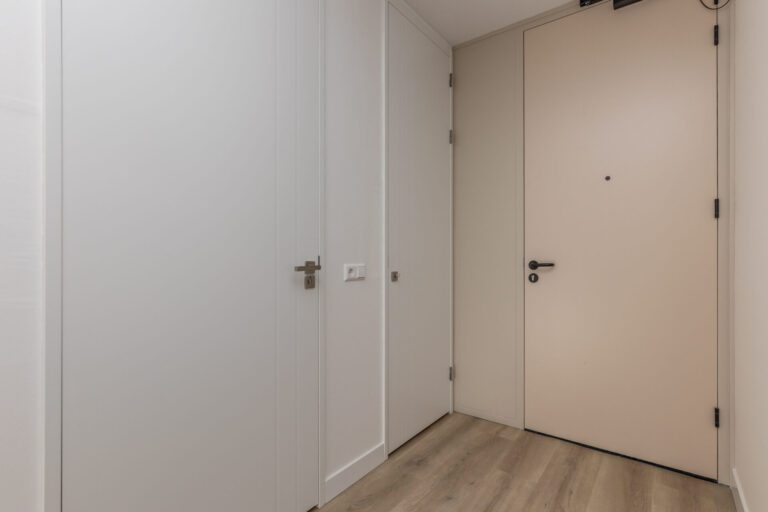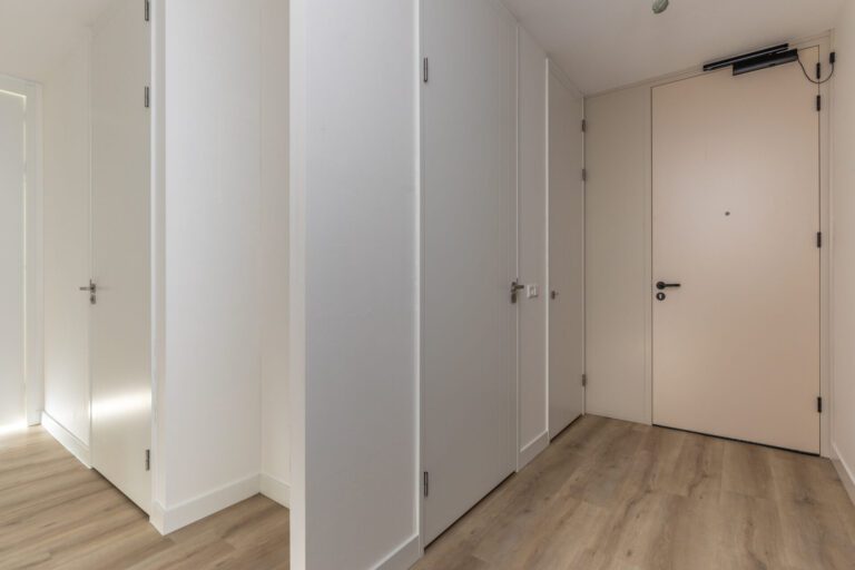 De voordeur van het appartement op de vijfde verdieping biedt toegang tot de entree. Hier bevinden zich een separaat toilet met fonteintje, de meterkast, ruimte voor een kapstok en/of schoenenkast en de technische ruimte met aansluiting voor de wasmachine en de warmtepompinstallatie.