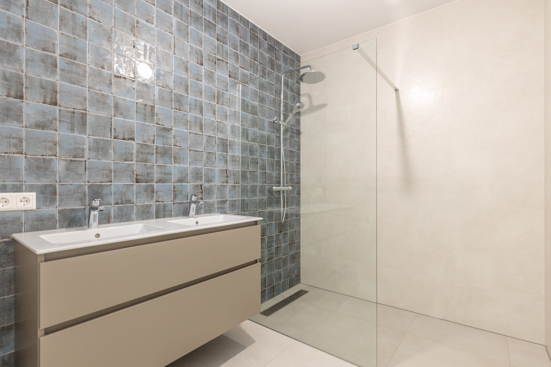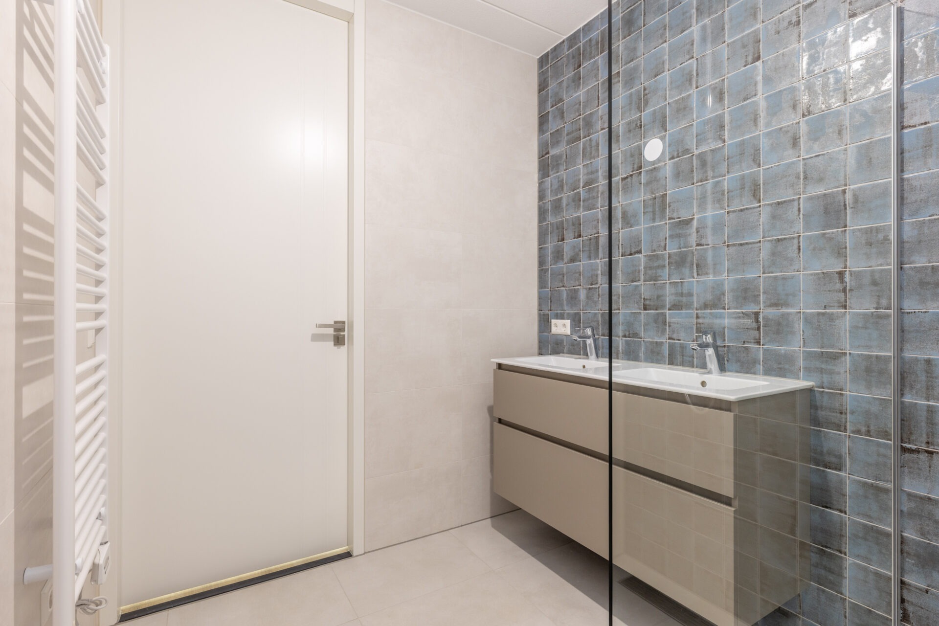 - Badkamer met een inloopdouche, dubbele wastafel en handdoekradiator;