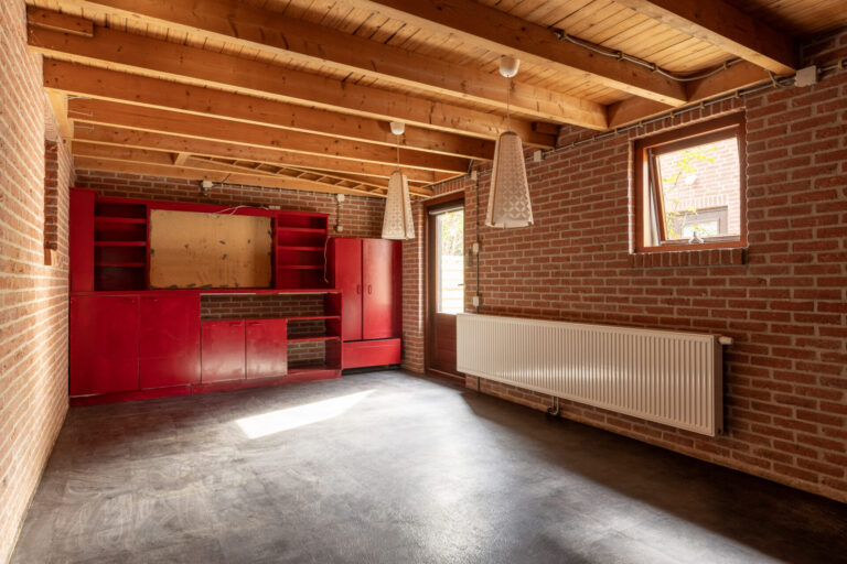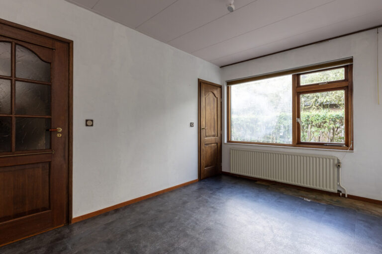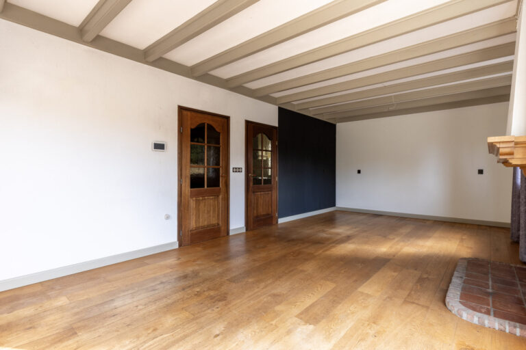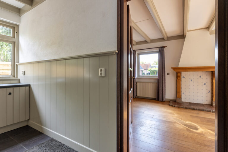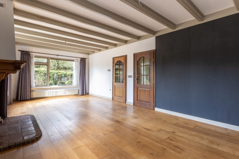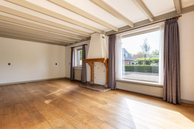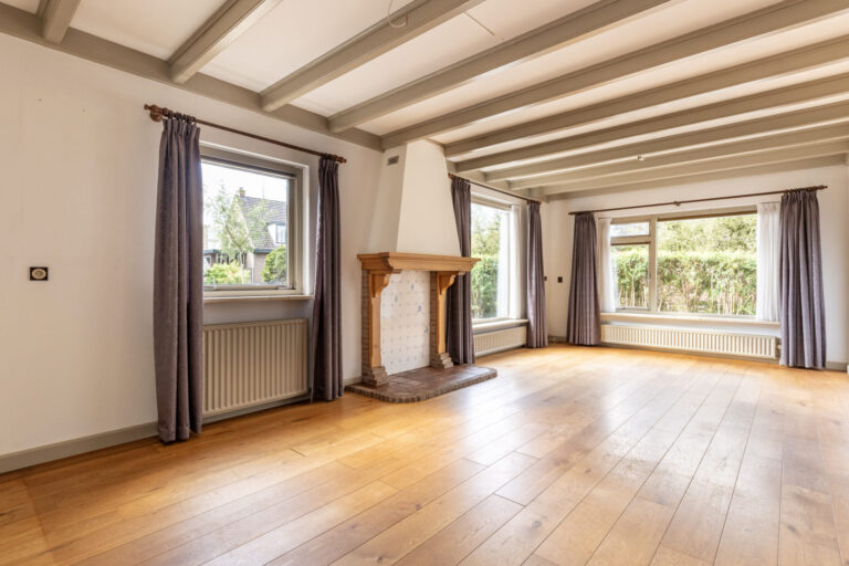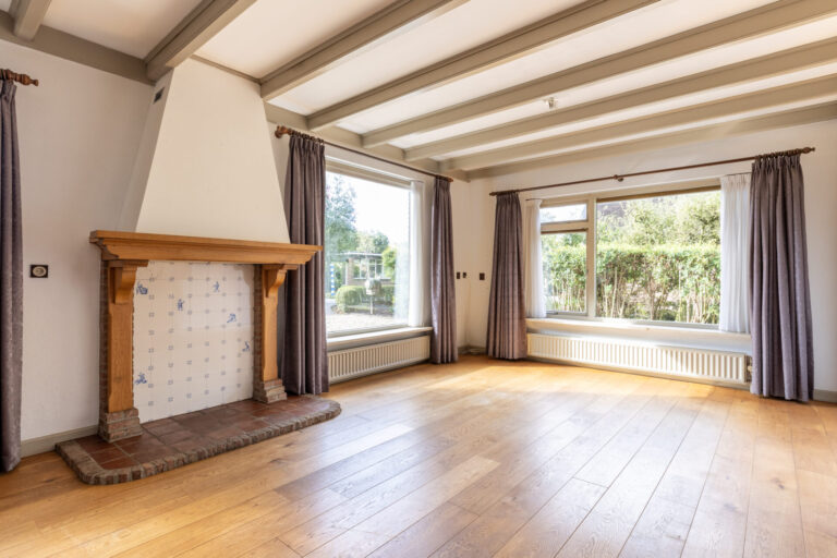 De woonkamer bevindt zich aan de voorzijde van de woning en beschikt over een fijne oppervlakte van circa 30,8 vierkante meter. Door de grote ramen is de woonkamer van een prettig lichtinval voorzien. De sfeervolle schouw biedt de mogelijkheid voor een houtkachel!