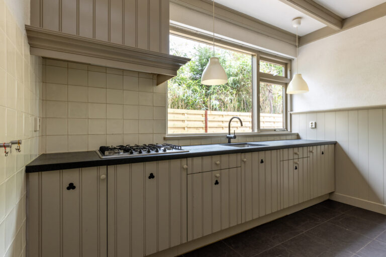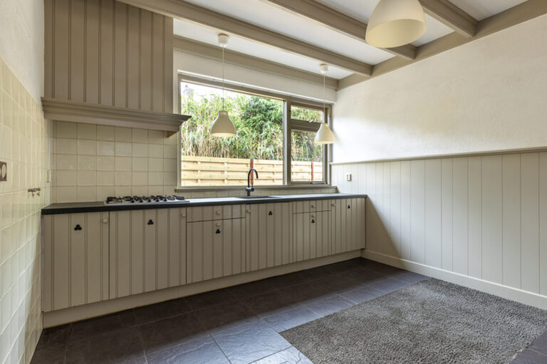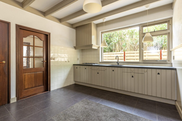 De keuken is bereikbaar via de entree, maar heeft ook een directe verbinding met de woonkamer. De ruime leefkeuken beschikt over een gasfornuis met afzuigkap, een spoelbak en close-in-boiler. Daarnaast is er een ruime voorraadkast aanwezig. De keuken biedt ruimte voor een prettige zithoek.