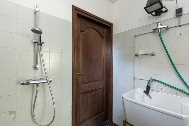 Vanuit de slaapkamer en de bijkeuken is de aangrenzende badkamer bereikbaar. Deze is voorzien van een douche en een wastafel.