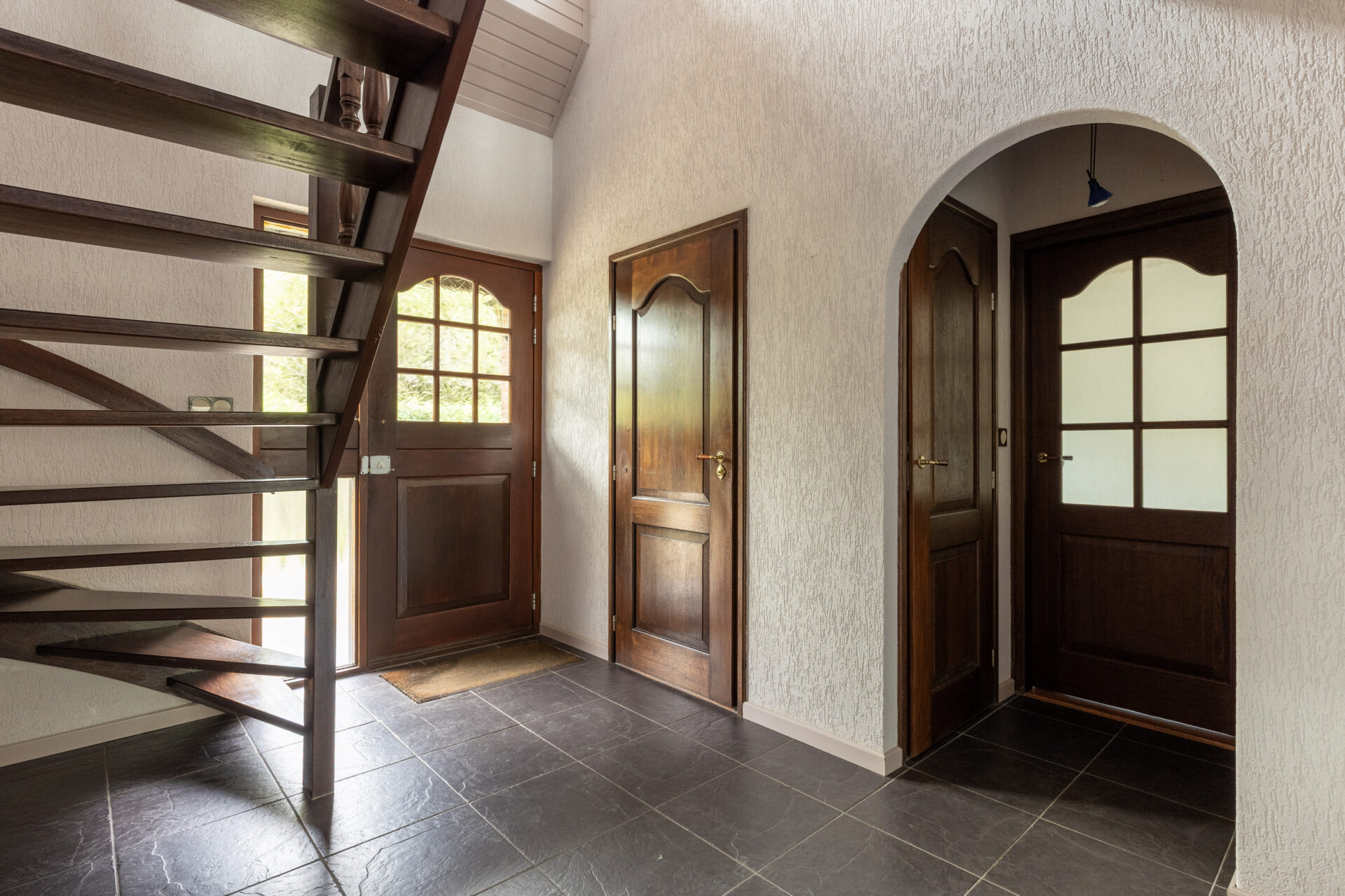 De voordeur bevindt zich aan de zijkant van de woning en biedt toegang tot de entree. De entree beschikt over een indrukwekkende hoogte door de vide. Hier bevinden zich het toilet, de meterkast en de trap naar de verdieping. Er is voldoende ruimte voor een ruime garderobe. Tevens biedt de entree toegang naar de keuken, de woonkamer en de slaapkamer op de begane grond.