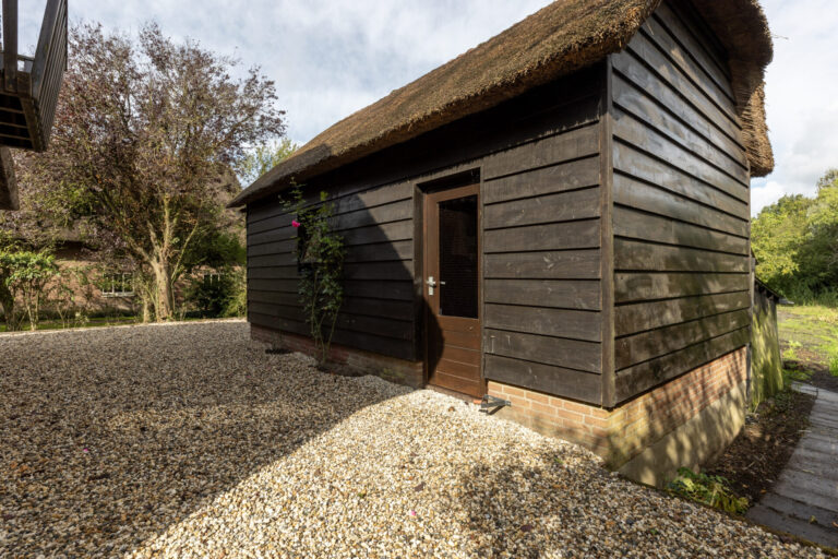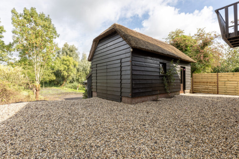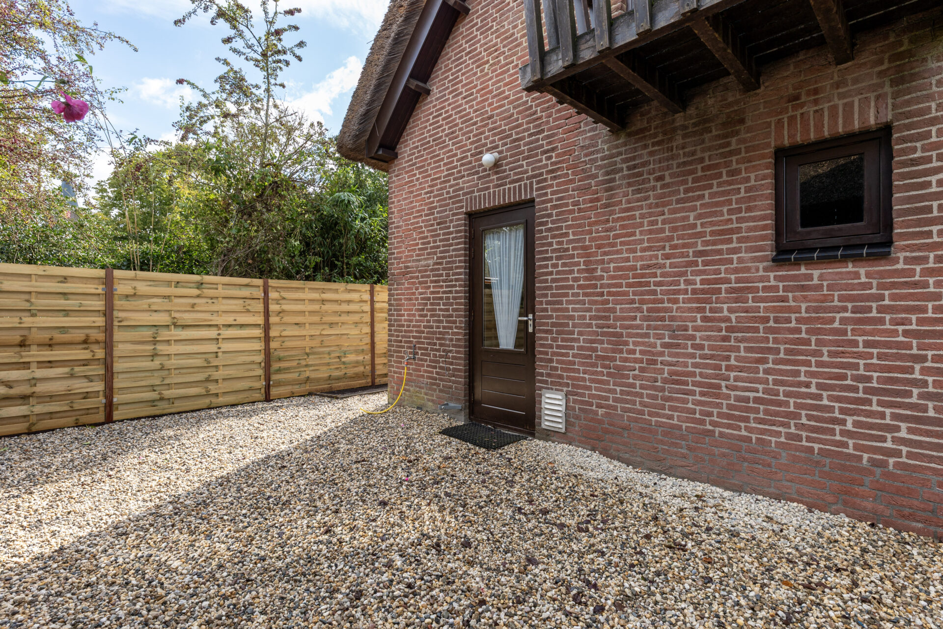 Achter de woning is een vrijstaand bijgebouw aanwezig, ideaal voor opslag of het parkeren van een auto of fietsen en (tuin)gereedschap.