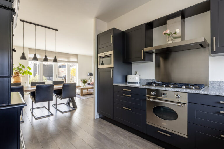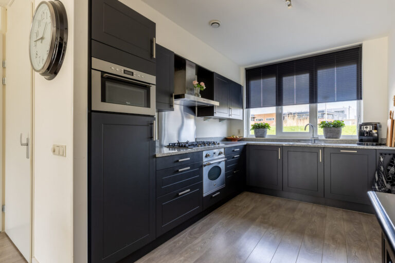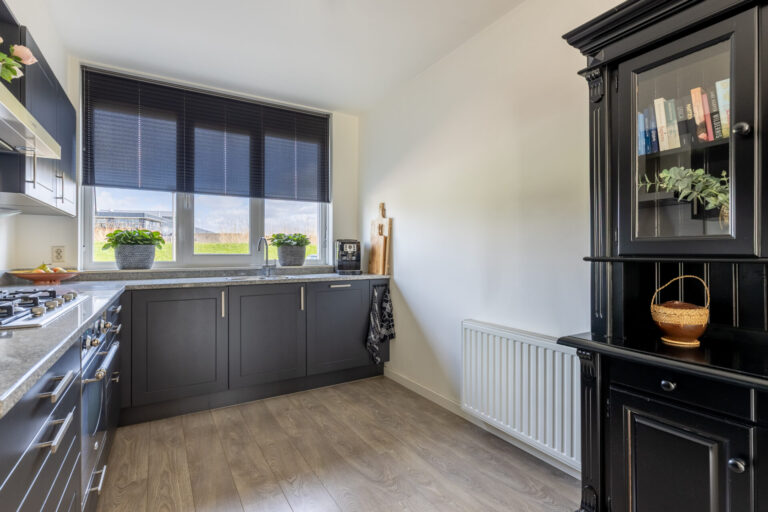 De entree biedt toegang tot de lichte woonkamer en aangrenzende keuken. De moderne keuken in L-opstelling bevindt zich aan de voorzijde van de woning en is uitgerust met een koelkast, een combimagnetron, een oven, een gasfornuis met afzuigkap, een spoelbak en een vaatwasser (2020). Vanuit de keuken kijkt u uit op een groene en open omgeving!