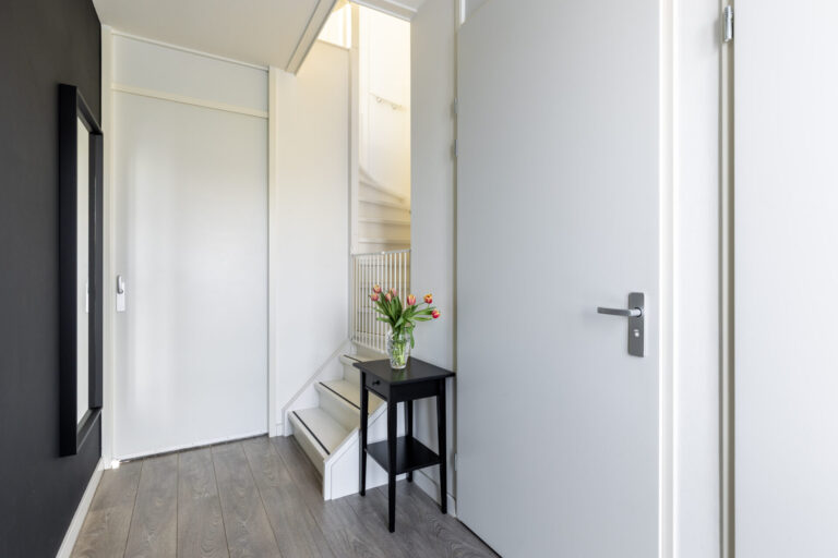 De voordeur van de woning is bereikbaar via de voortuin. Deze biedt toegang tot de hal, met het toilet met fonteintje, de meterkast en de trapopgang naar de eerste verdieping.
