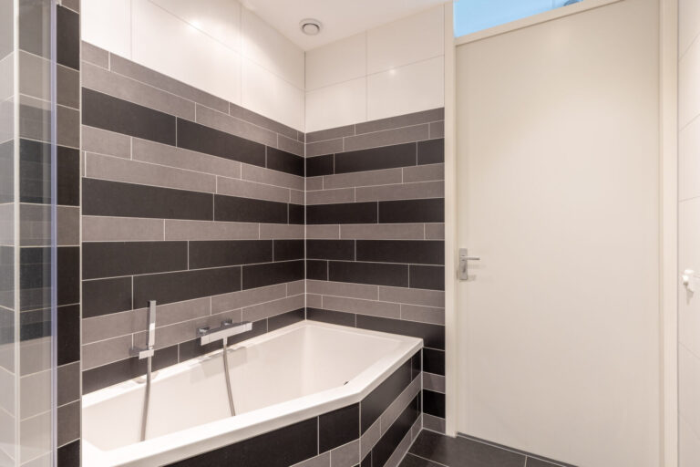 De badkamer is tussen de slaapkamers gelegen. Deze is voorzien van een douche, een wastafelmeubel en een ligbad. Het tweede, apart gesitueerde toilet bevindt zich naast de trapopgang.
