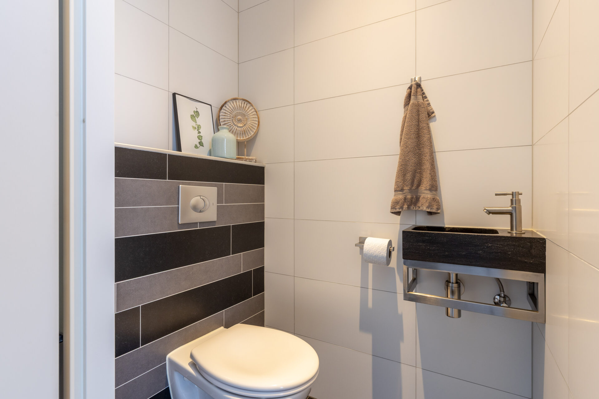 De voordeur van de woning is bereikbaar via de voortuin. Deze biedt toegang tot de hal, met het toilet met fonteintje, de meterkast en de trapopgang naar de eerste verdieping.