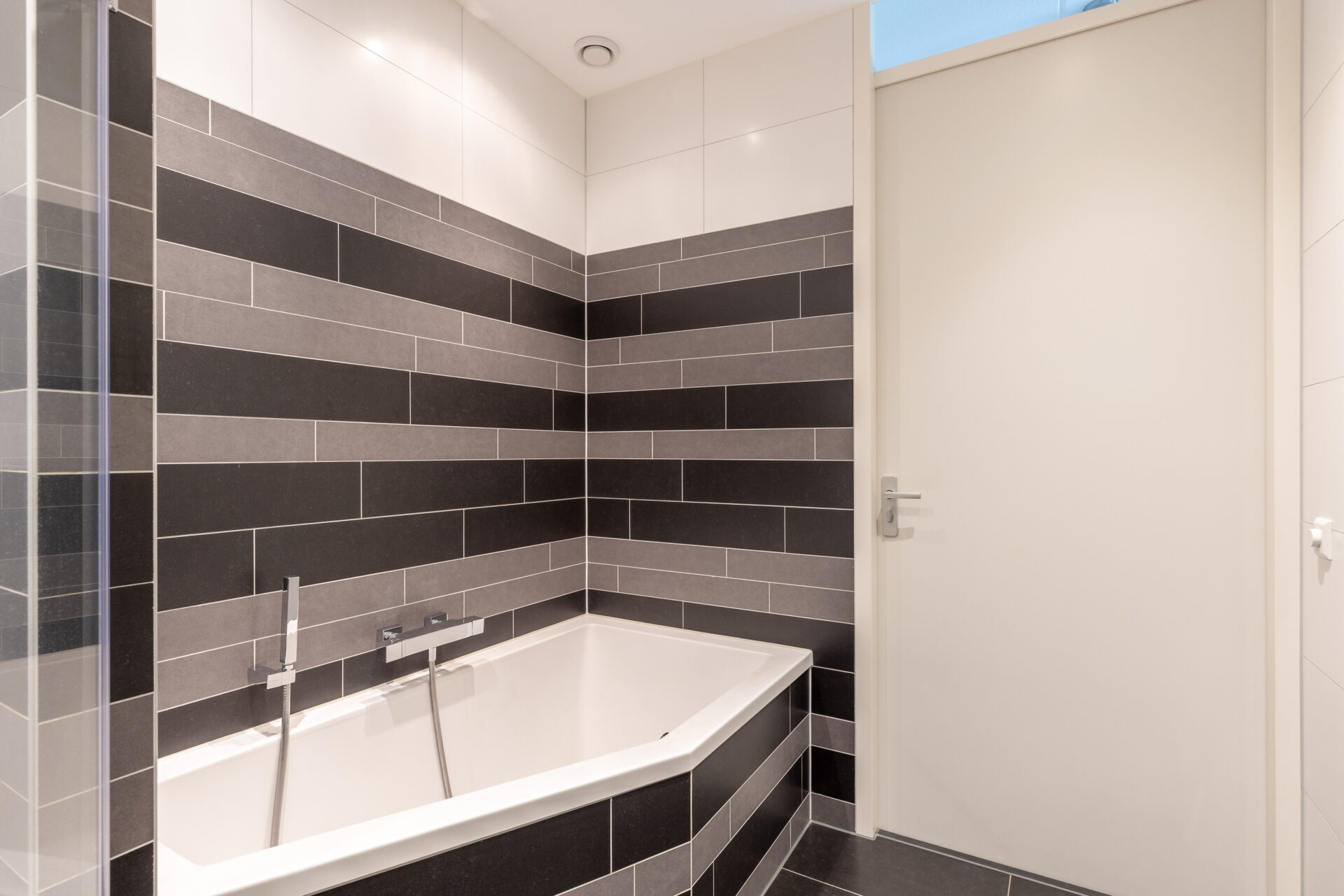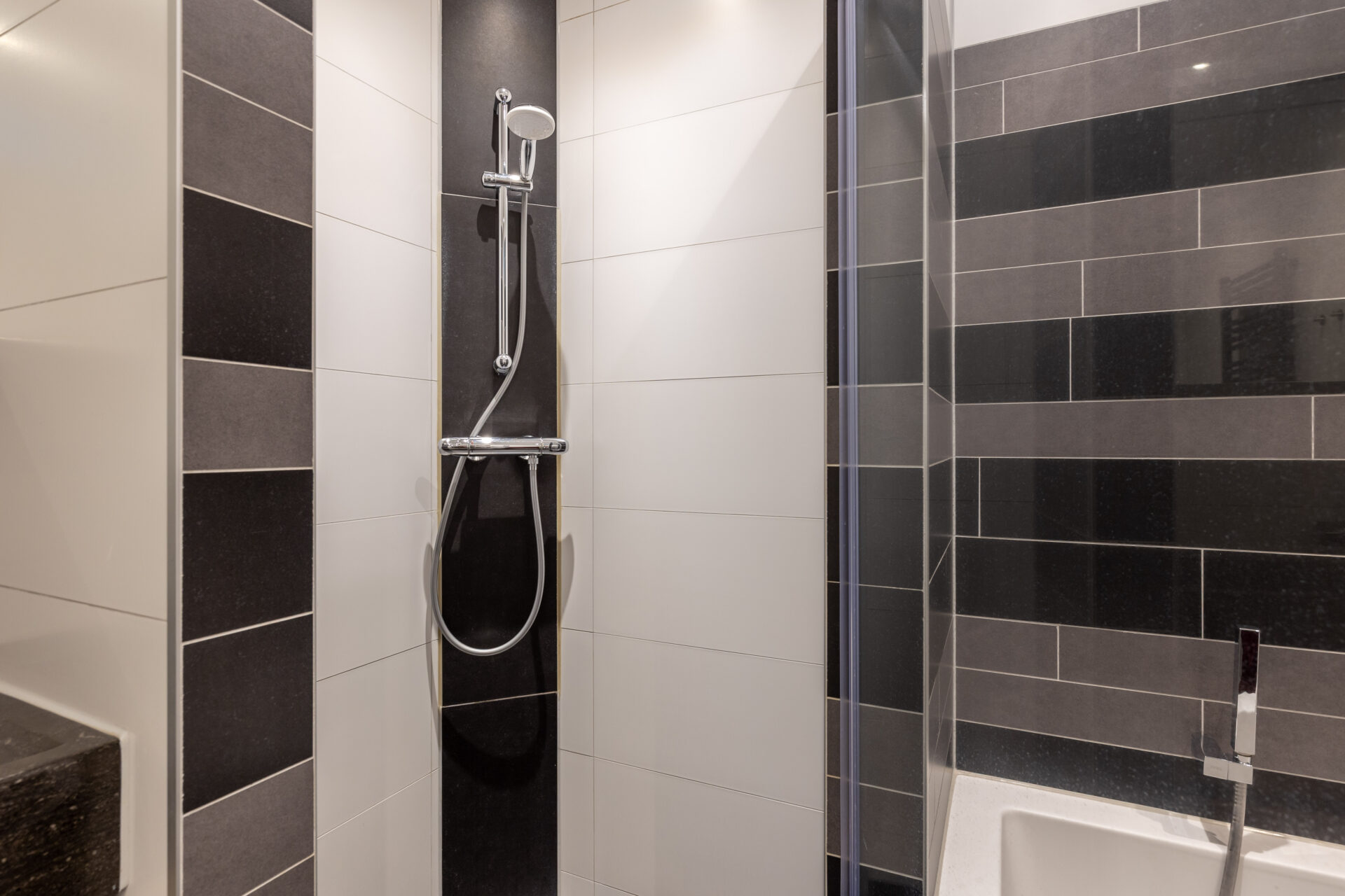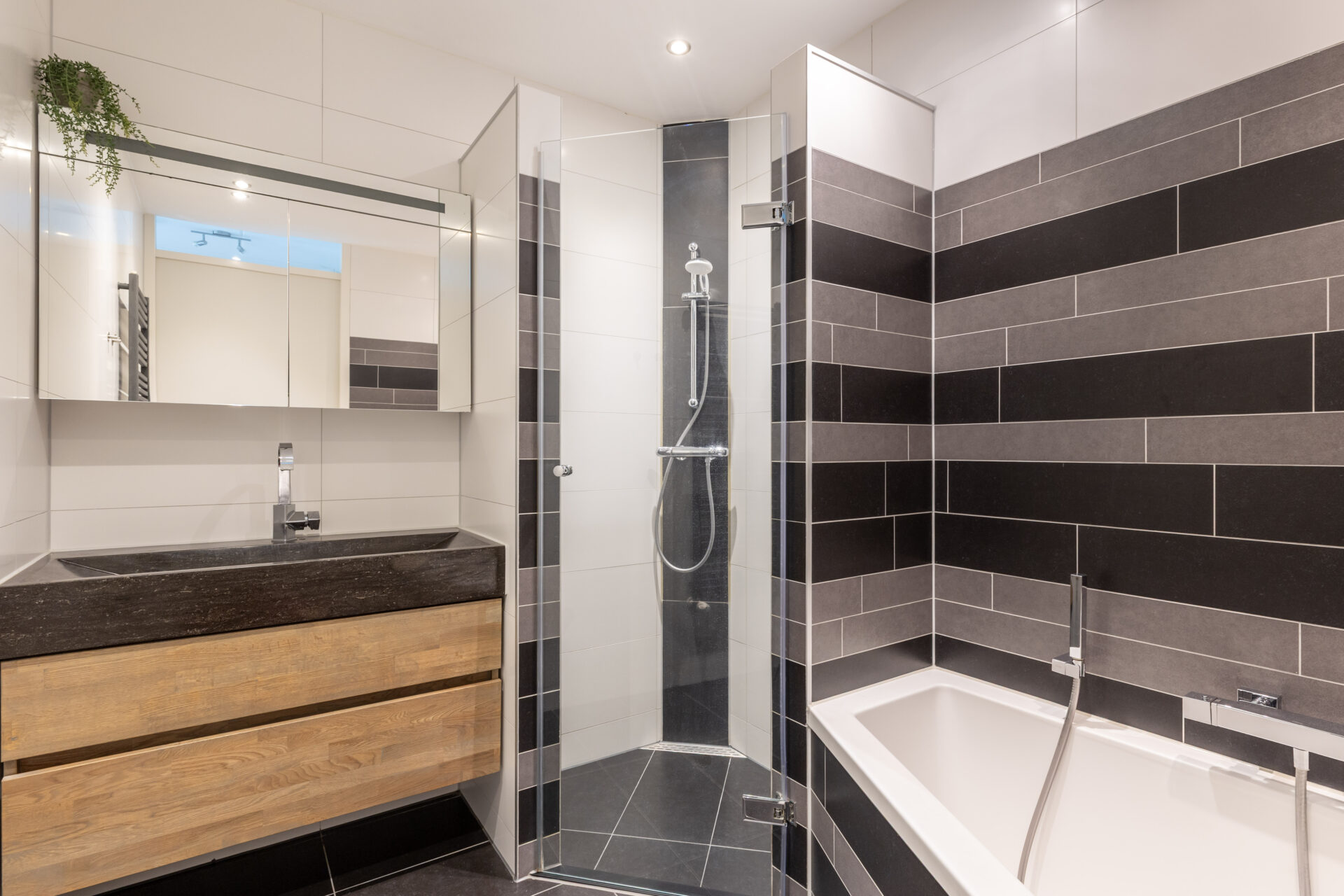 • Badkamer met douche, wastafelmeubel en ligbad en een los tweede toilet;