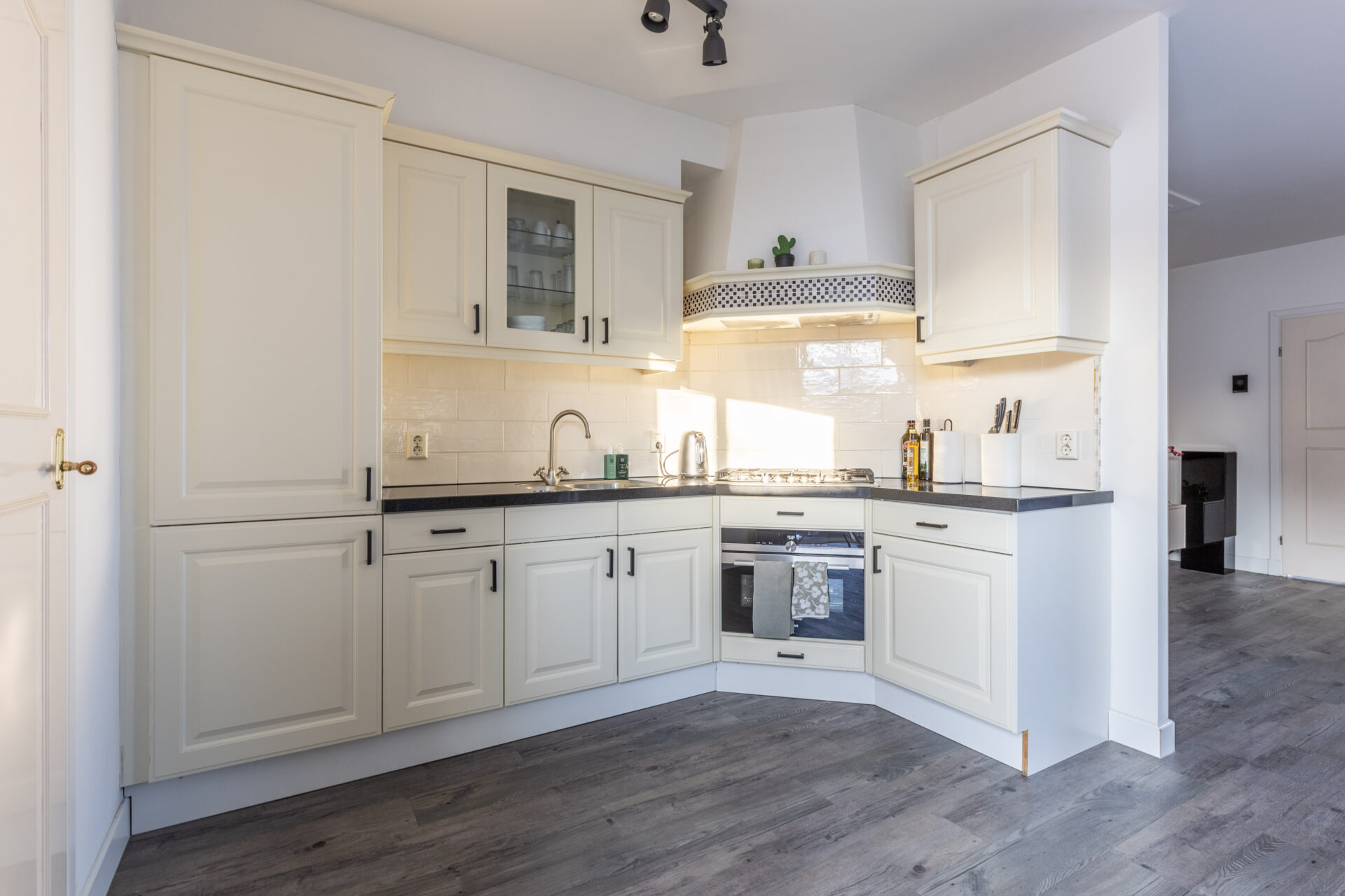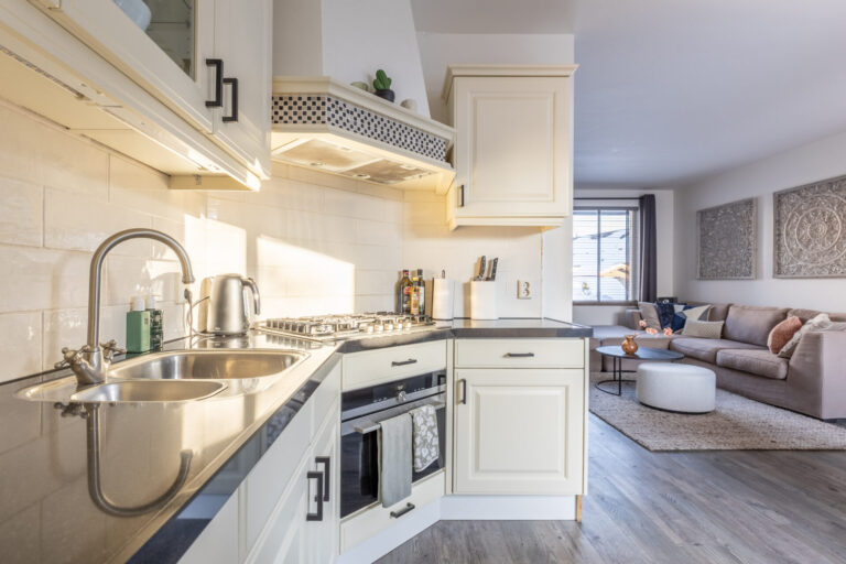 De entree biedt toegang tot de woonkamer met open keuken. De zithoek bevindt zich aan de voorzijde van de woonkamer. Aan de achterzijde zijn de eethoek en de open keuken gelegen. De keuken is uitgerust met een spoelbak, een vaatwasser, een gasfornuis, een afzuigkap, een oven (2024), een koelkast en een vriezer.