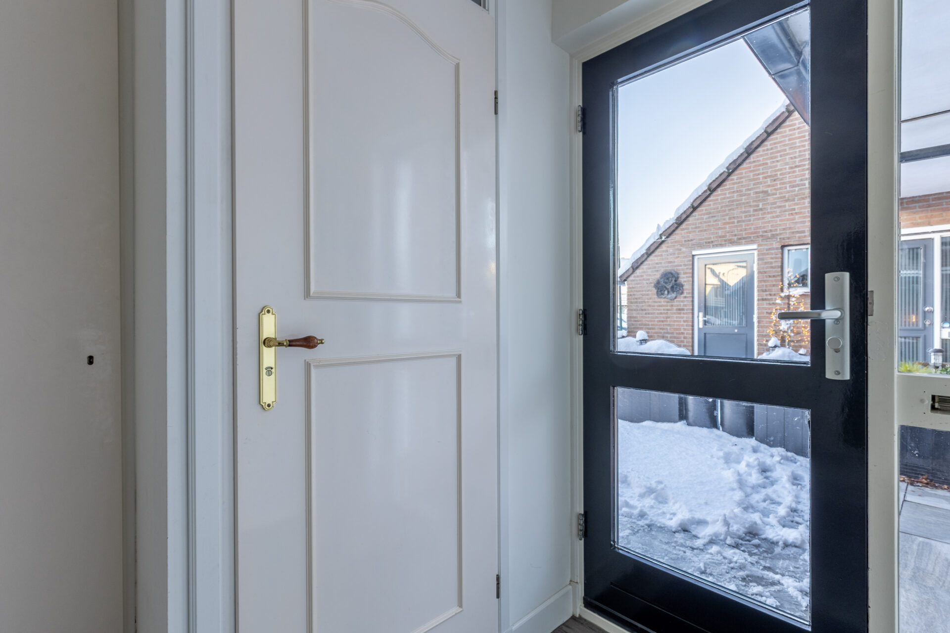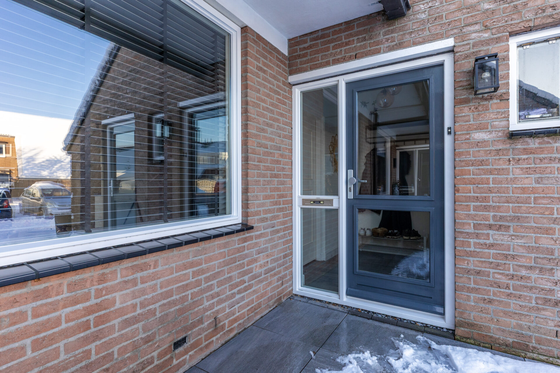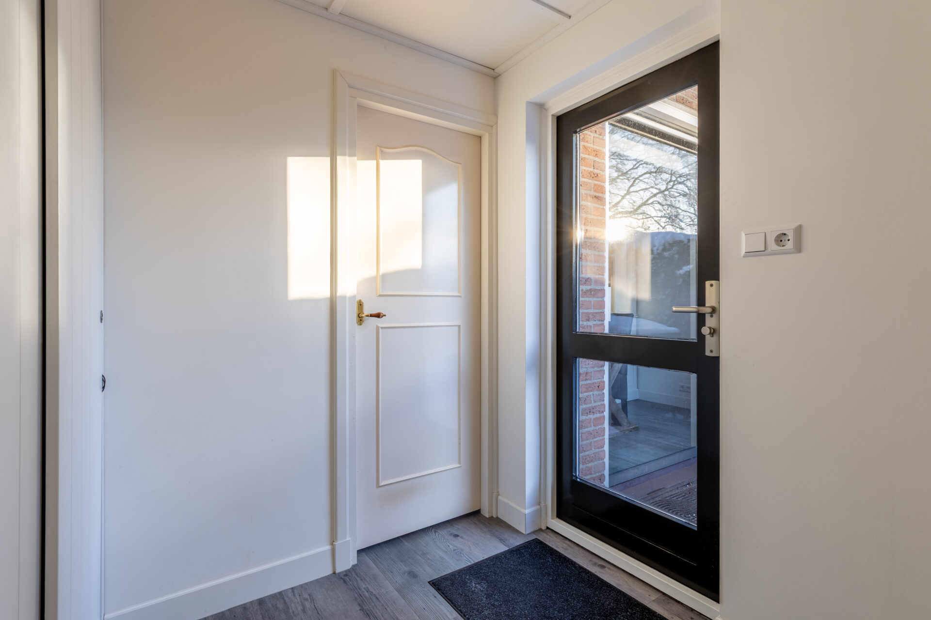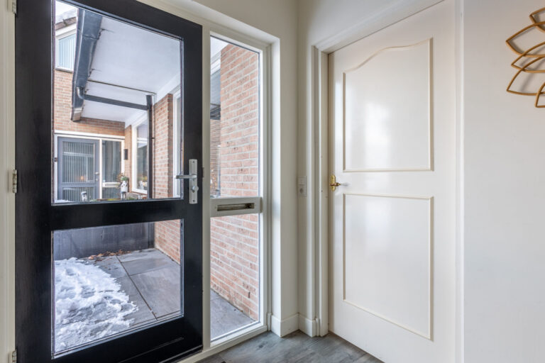 De voordeur bevindt zich aan de zijkant van de woning en is bereikbaar via de voortuin. Via de voordeur komt men in de entree. Hier bevinden zich het toilet met fonteintje, de meterkast en ruimte voor een kapstok en/of schoenenkast.