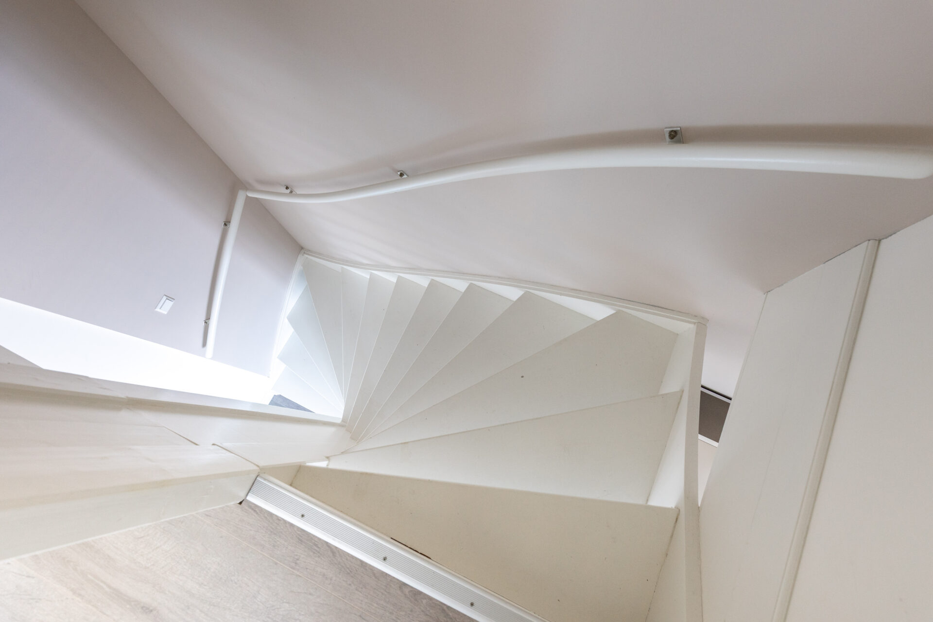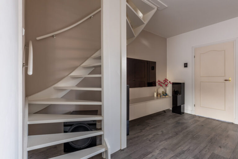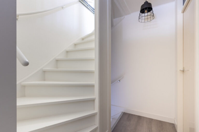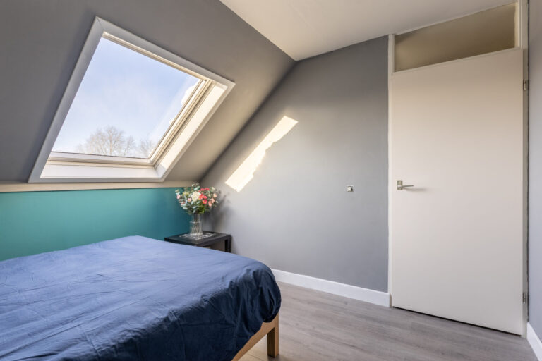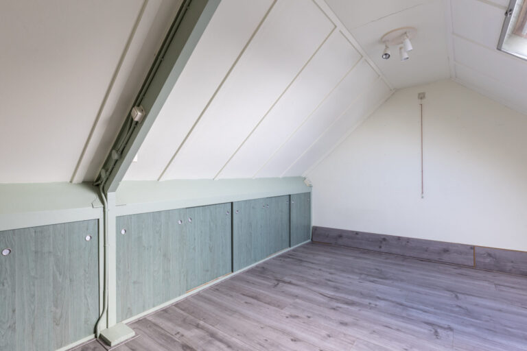 De vaste trap op de overloop biedt toegang tot de tweede verdieping. Deze is nu ingericht als open ruimte van circa 12,3 vierkante meter, maar biedt de mogelijkheid om een extra slaapkamer te creëren.