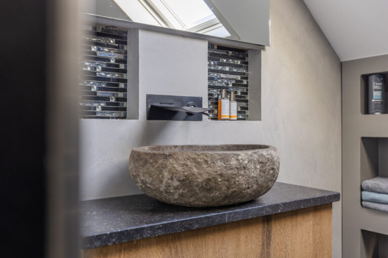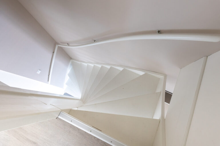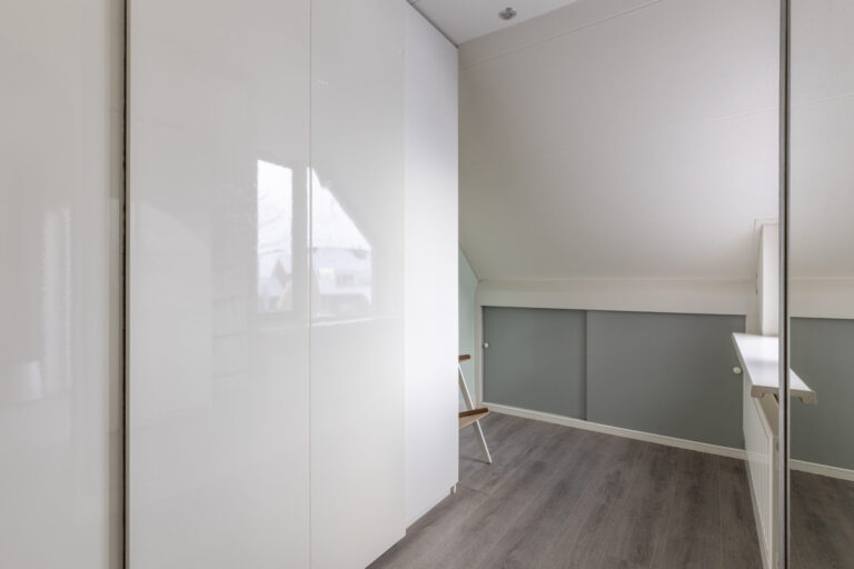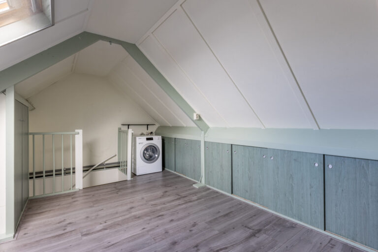 Op de tweede verdieping bevindt zich de wasmachine-aansluiting. In de punten van de woning is opbergruimte gecreëerd.