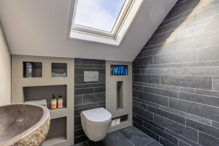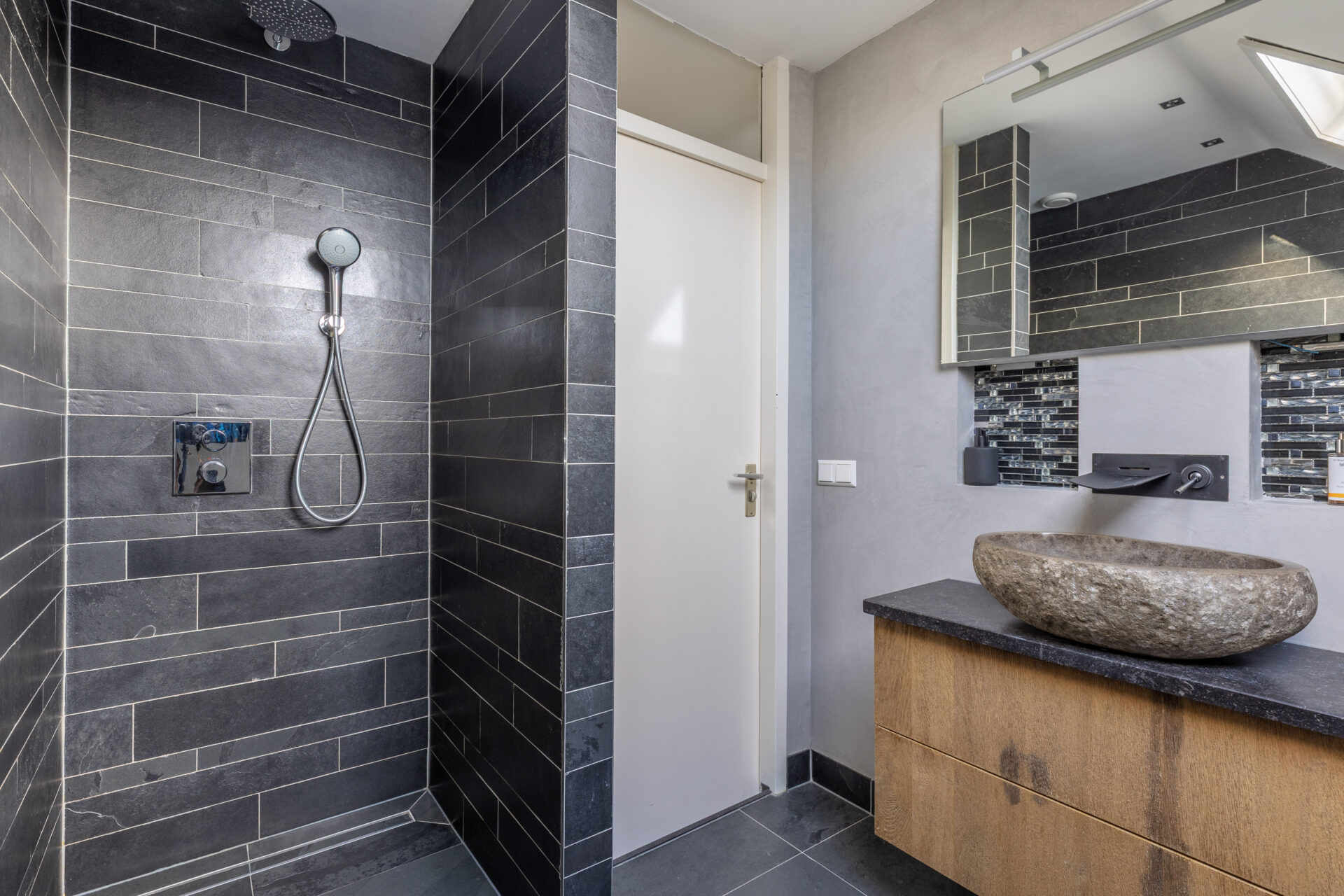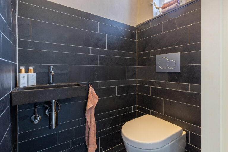 Hiernaast bevindt zich de moderne badkamer, welke is uitgerust met een inloopdouche, een wastafelmeubel en een tweede toilet.
