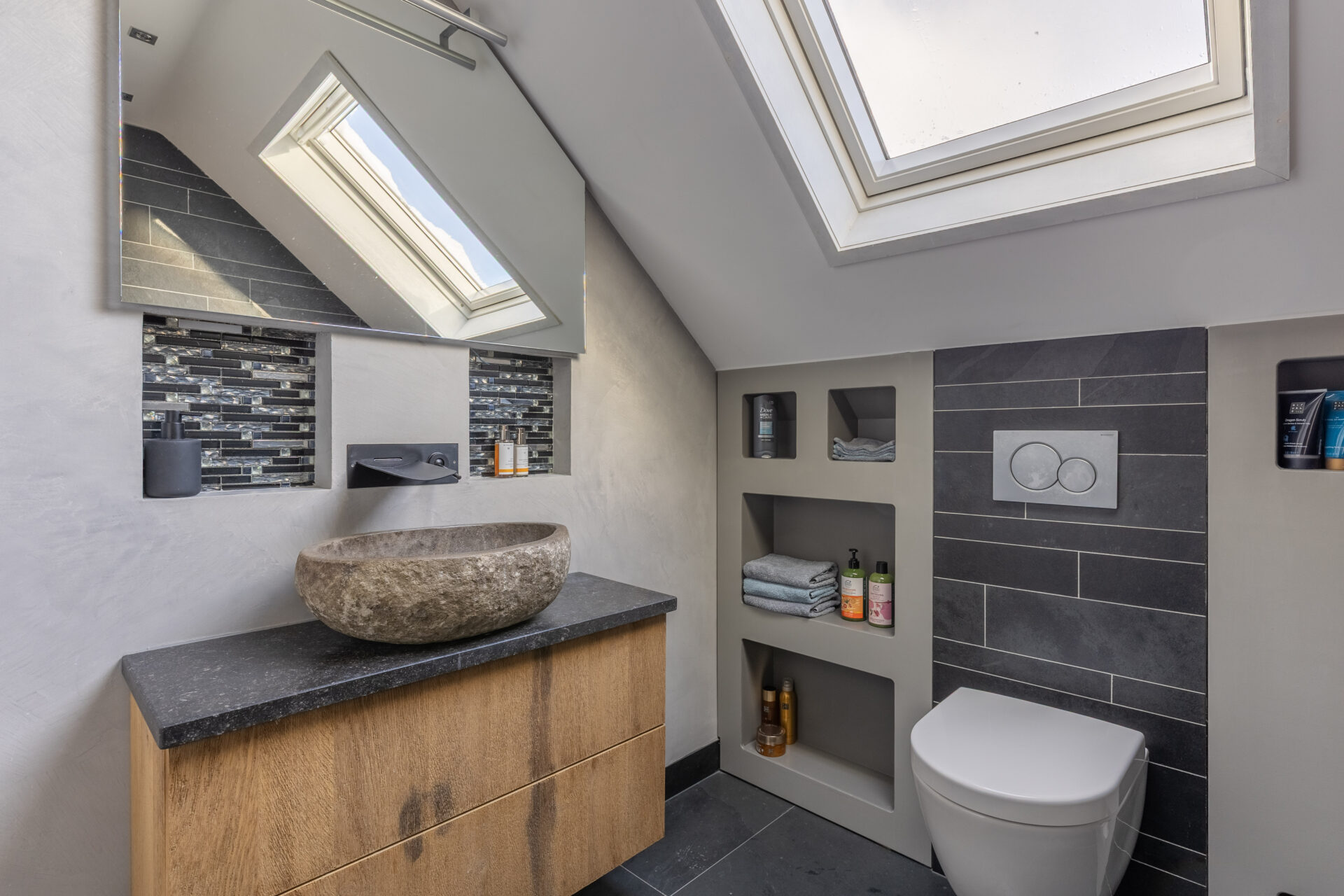 Badkamer met een inloopdouche, wastafelmeubel, tweede toilet en vloerverwarming;