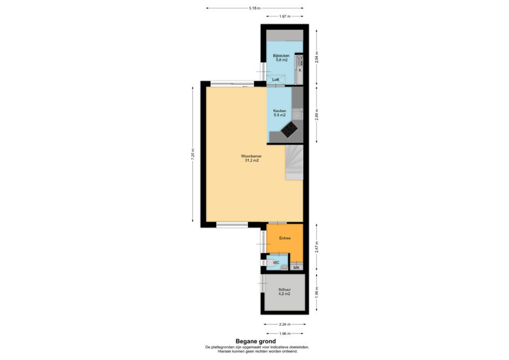 * De woning is ingemeten conform de branchebrede meetinstructies (BBMI), afgeleid van de NEN 2580 normering. De meetinstructie is bedoeld om een meer eenduidige manier van meten toe te passen voor het geven van een indicatie van de gebruiksoppervlakte. De meetinstructie sluit verschillen in meetuitkomsten niet volledig uit, door bijvoorbeeld interpretatieverschillen, afrondingen of beperkingen bij het uitvoeren van de meting.