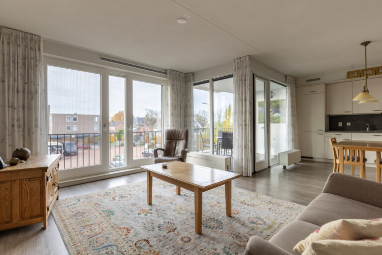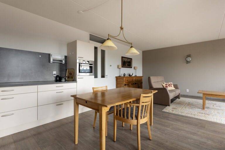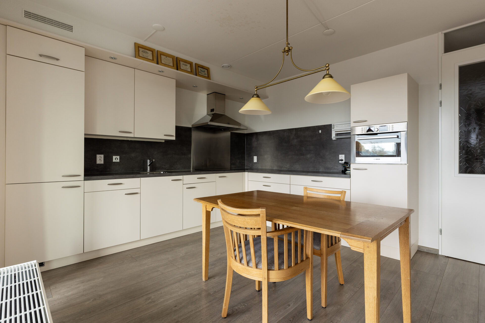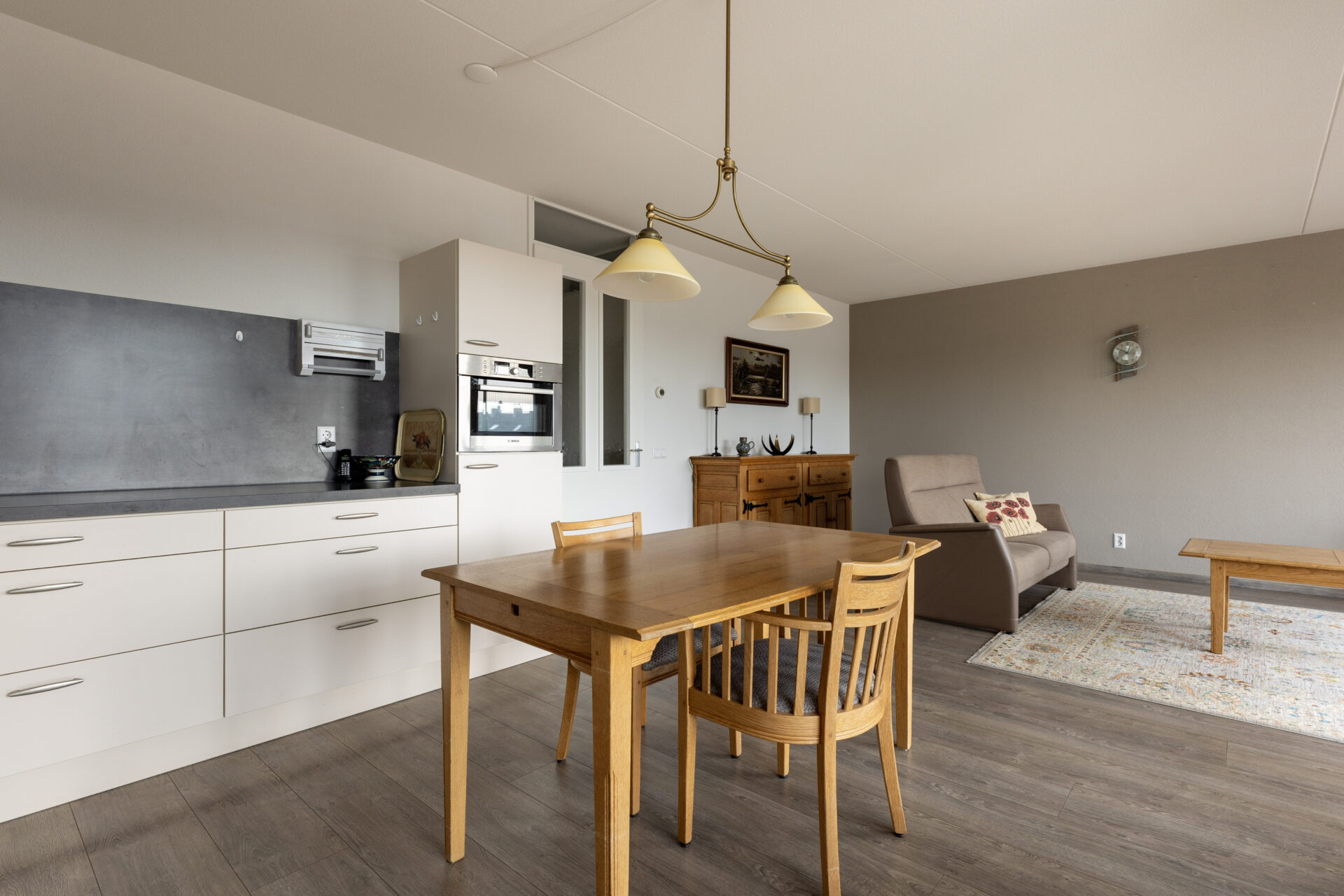 De woonkamer is gesitueerd aan de achterzijde van het appartement. Deze biedt uitzicht over het Koning Willem-Alexanderplein. In de woonkamer bevinden zich een riante zithoek, een prettige eethoek en een open keuken. De keuken is uitgerust met een inductiekookplaat met afzuigkap, een combimagnetron, een spoelbak, een vaatwasser en een koel-vriescombinatie. Vanuit de keuken is het ruime balkon op het zuidwesten bereikbaar. Het balkon biedt voldoende ruimte voor een zit- of eethoek.