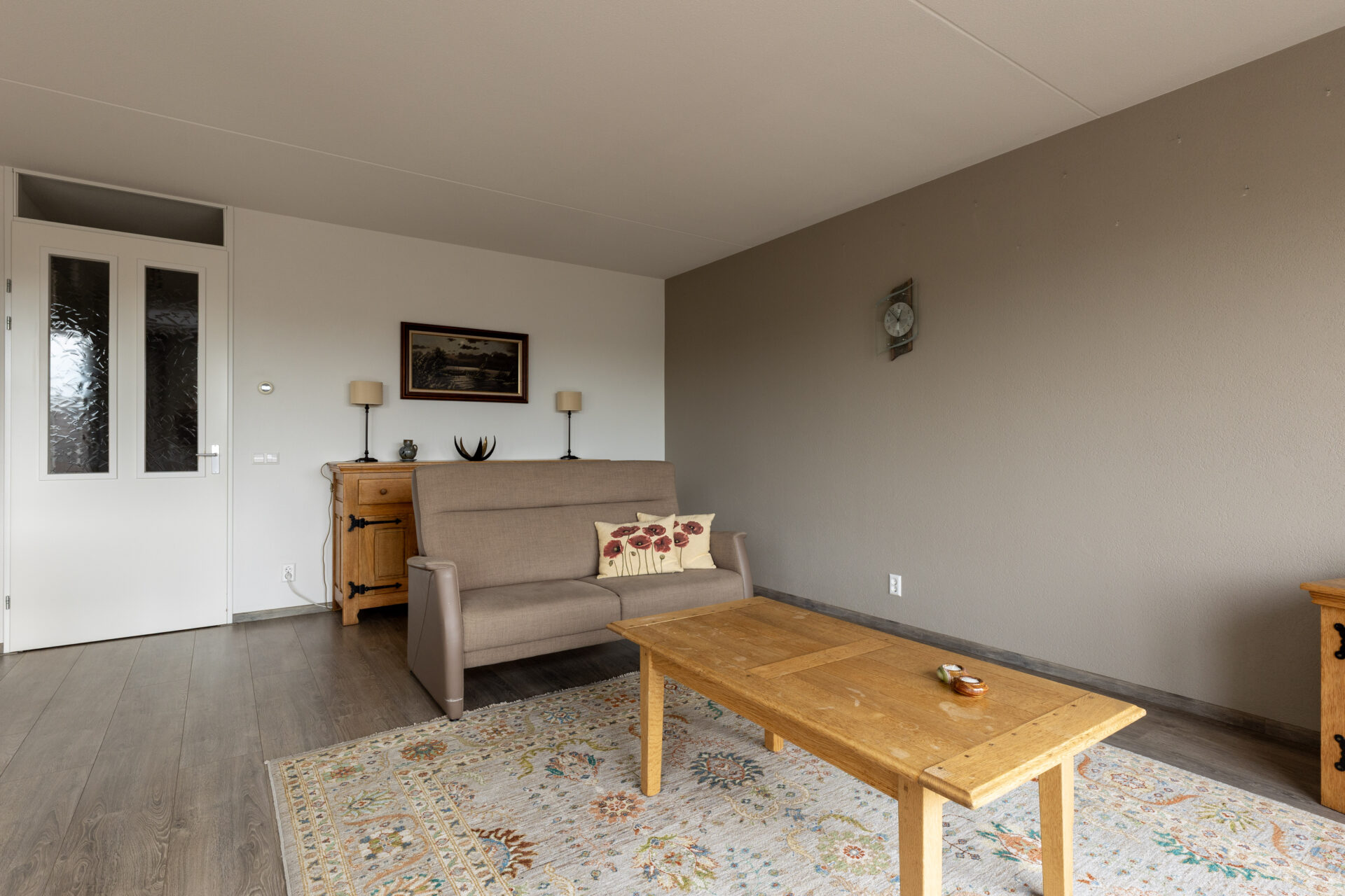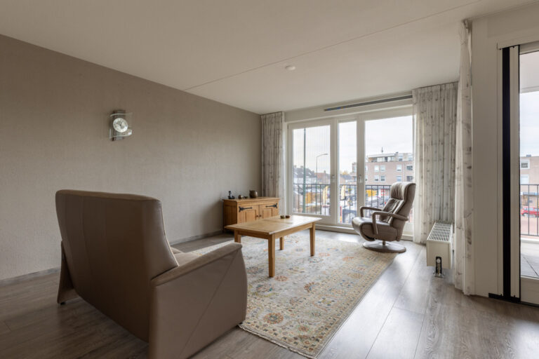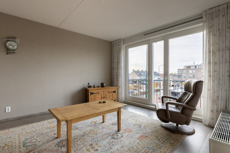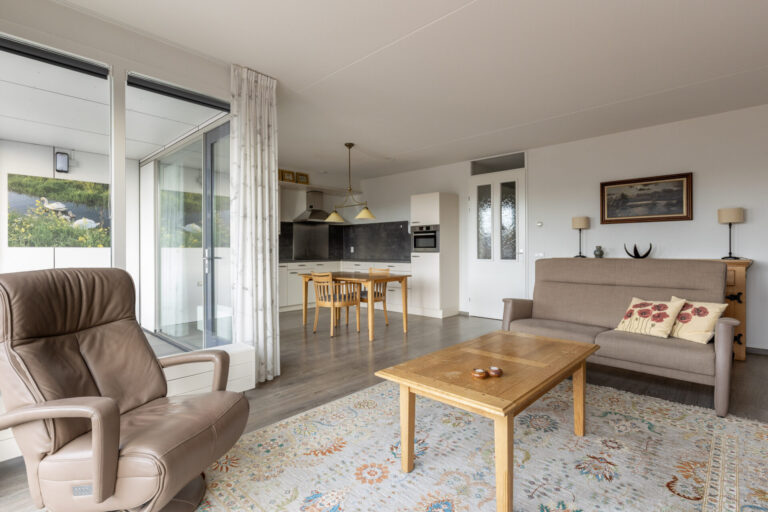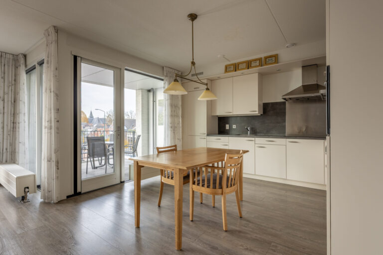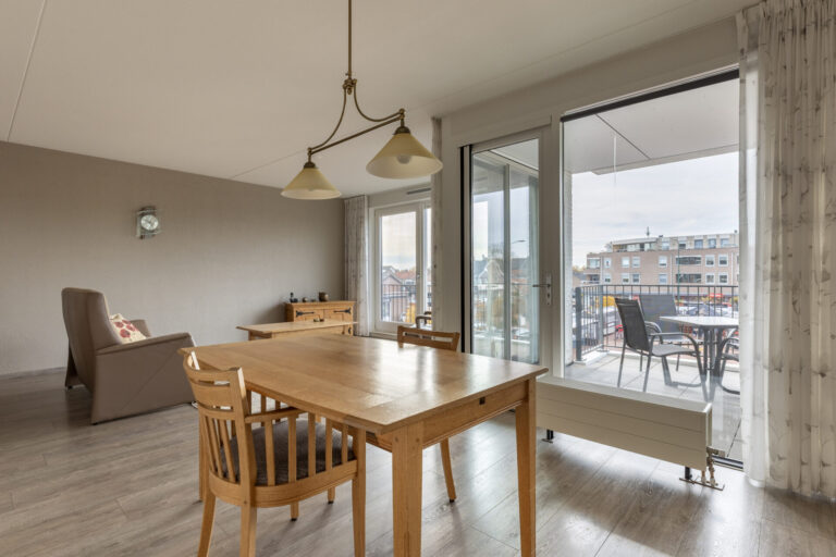 De woonkamer is gesitueerd aan de achterzijde van het appartement. Deze biedt uitzicht over het Koning Willem-Alexanderplein. In de woonkamer bevinden zich een riante zithoek, een prettige eethoek en een open keuken. De keuken is uitgerust met een inductiekookplaat met afzuigkap, een combimagnetron, een spoelbak, een vaatwasser en een koel-vriescombinatie. Vanuit de keuken is het ruime balkon op het zuidwesten bereikbaar. Het balkon biedt voldoende ruimte voor een zit- of eethoek.