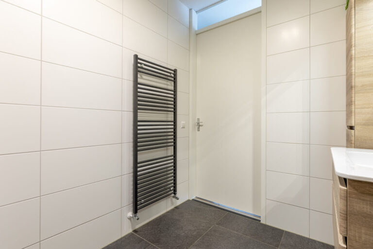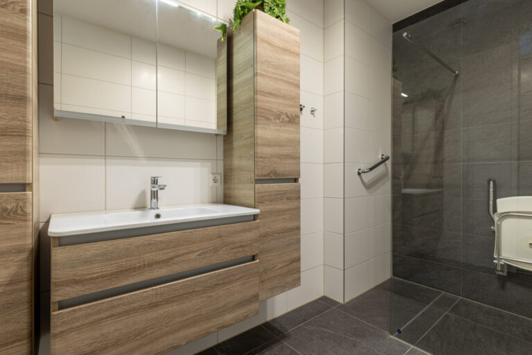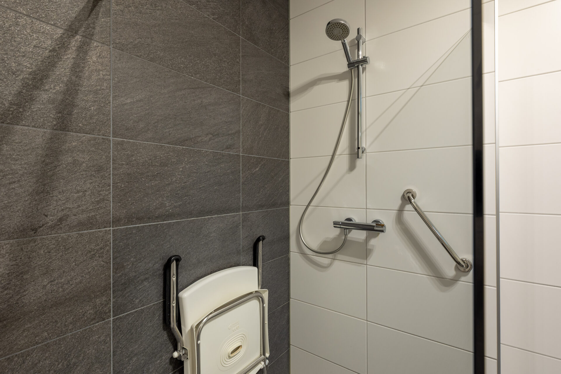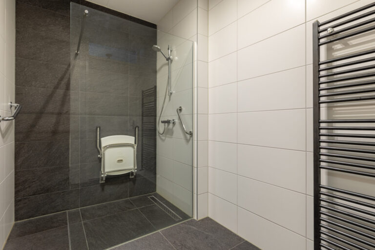Naast de grootste slaapkamer bevindt zich de badkamer. Deze beschikt over een ruime inloopdouche en een wastafelmeubel met veel opbergruimte.