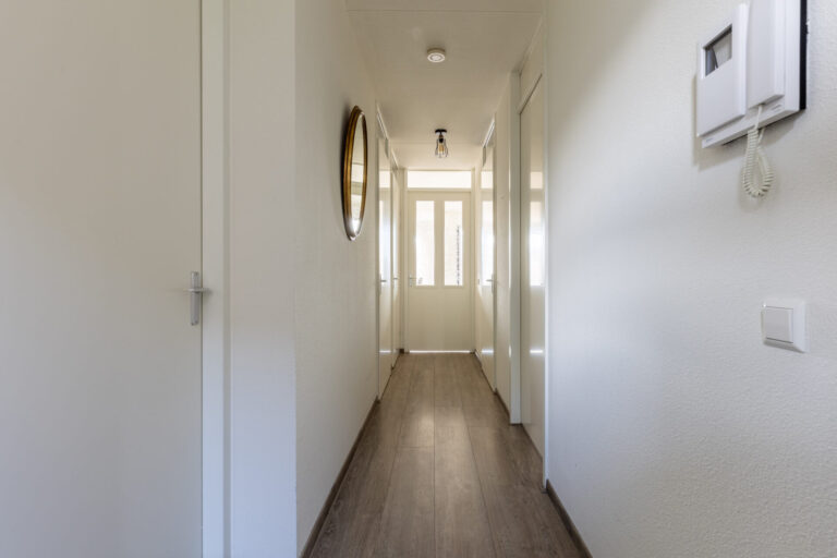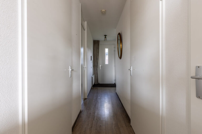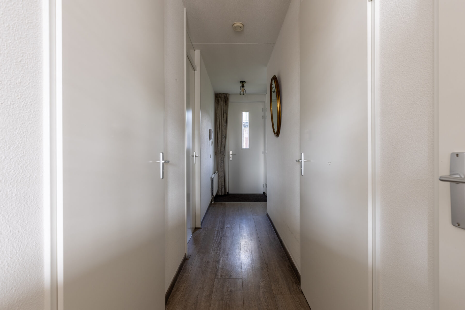 De voordeur van de woning bevindt zich in de galerij van de eerste verdieping. Zo betreedt men de entree van de woning, welke toegang biedt tot de overige ruimtes van het appartement. Hier bevindt zich tevens de meterkast. Bovendien beschikt de entree over de ruimte voor een kapstok en/of schoenenkast.