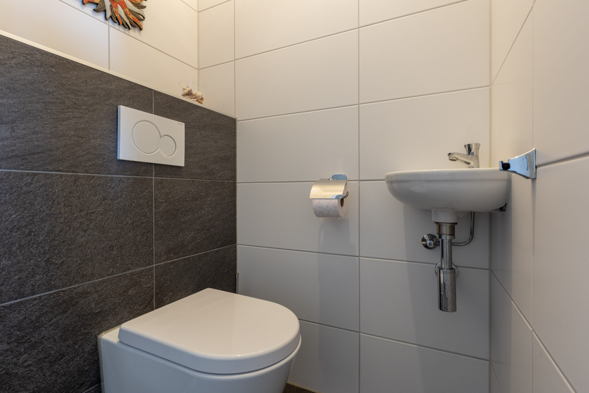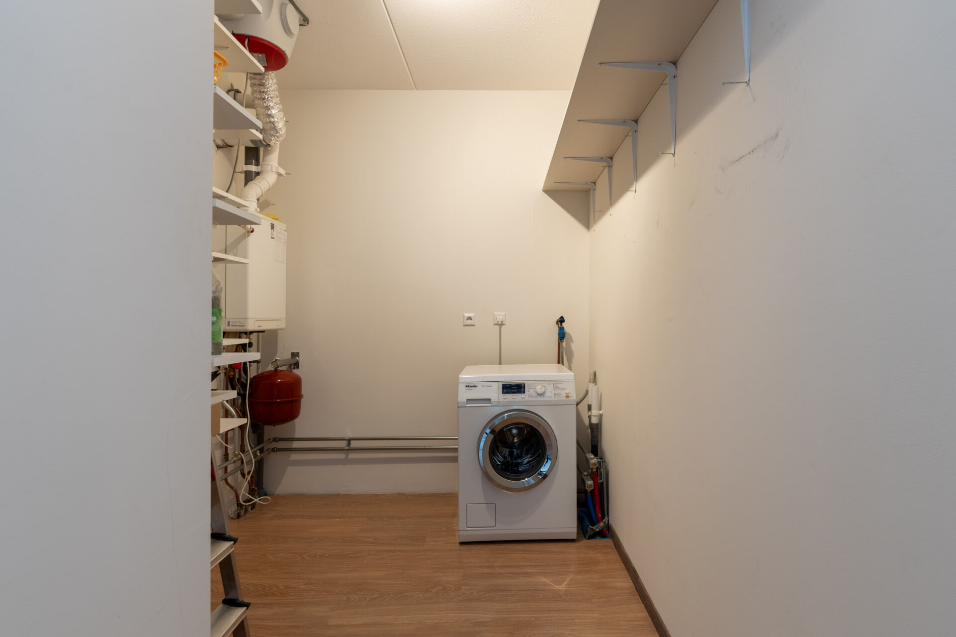 Tegenover de badkamer zijn het losse toilet met fonteintje en de wasruimte gesitueerd. In de wasruimte bevinden zich de cv-ketel en de wasmachineaansluiting. Tevens beschikt deze ruimte over een fijne hoeveelheid opbergruimte.