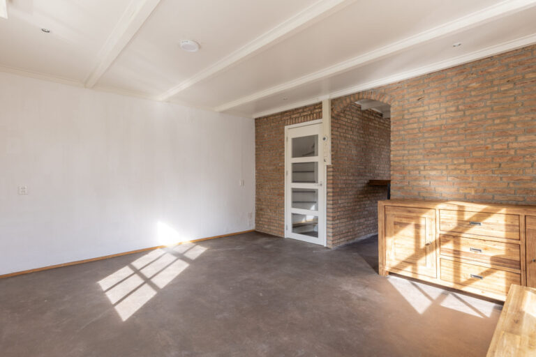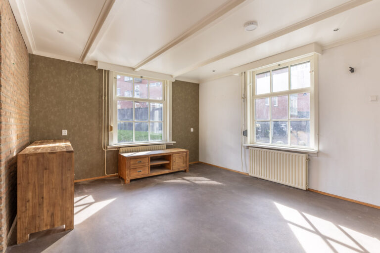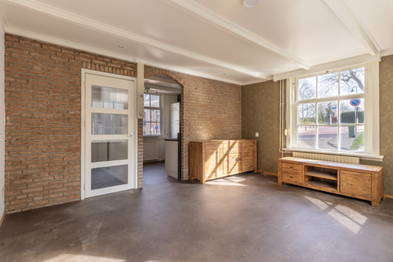 De woonkamer bevindt zich aan de achterzijde van de woning. Door de grote ramen beschikt deze ruimte over een prettig lichtinval.
