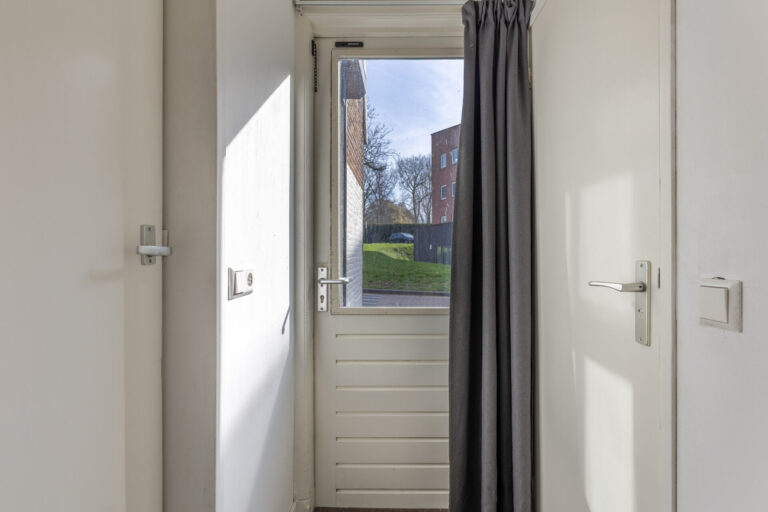 Via de voordeur, aan de voorzijde van de woning, bereikt men de entree. Hier bevinden zich de meterkast, een praktische trapkast en de trapopgang naar de verdieping. De entree biedt toegang tot de woonkamer en de aangrenzende keuken.