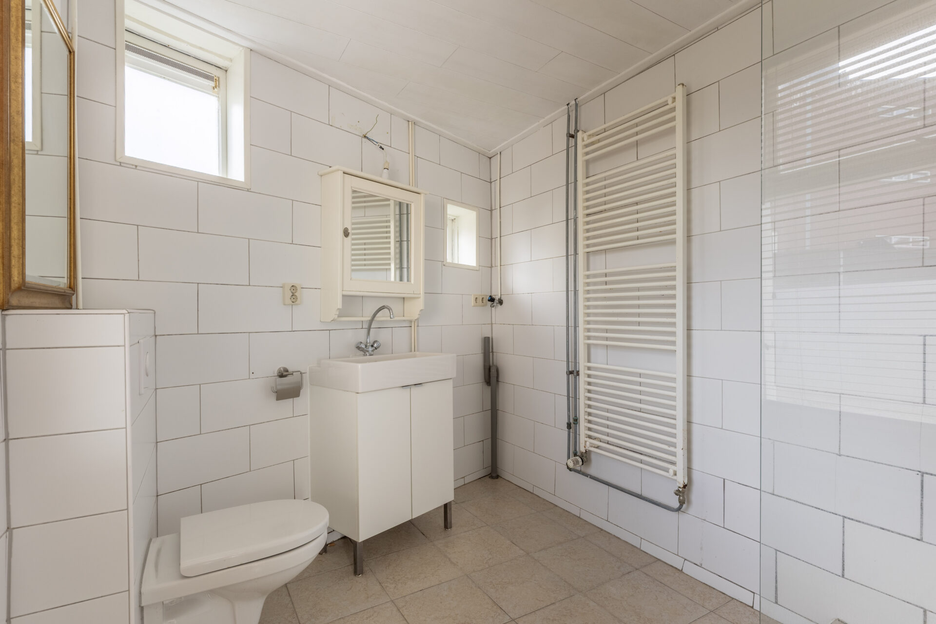 De badkamer is uitgerust met een toilet, een wastafelmeubel, een handdoekenradiator, een inloopdouche en een aansluiting voor de wasmachine.