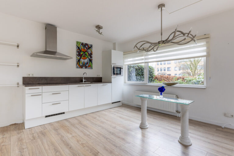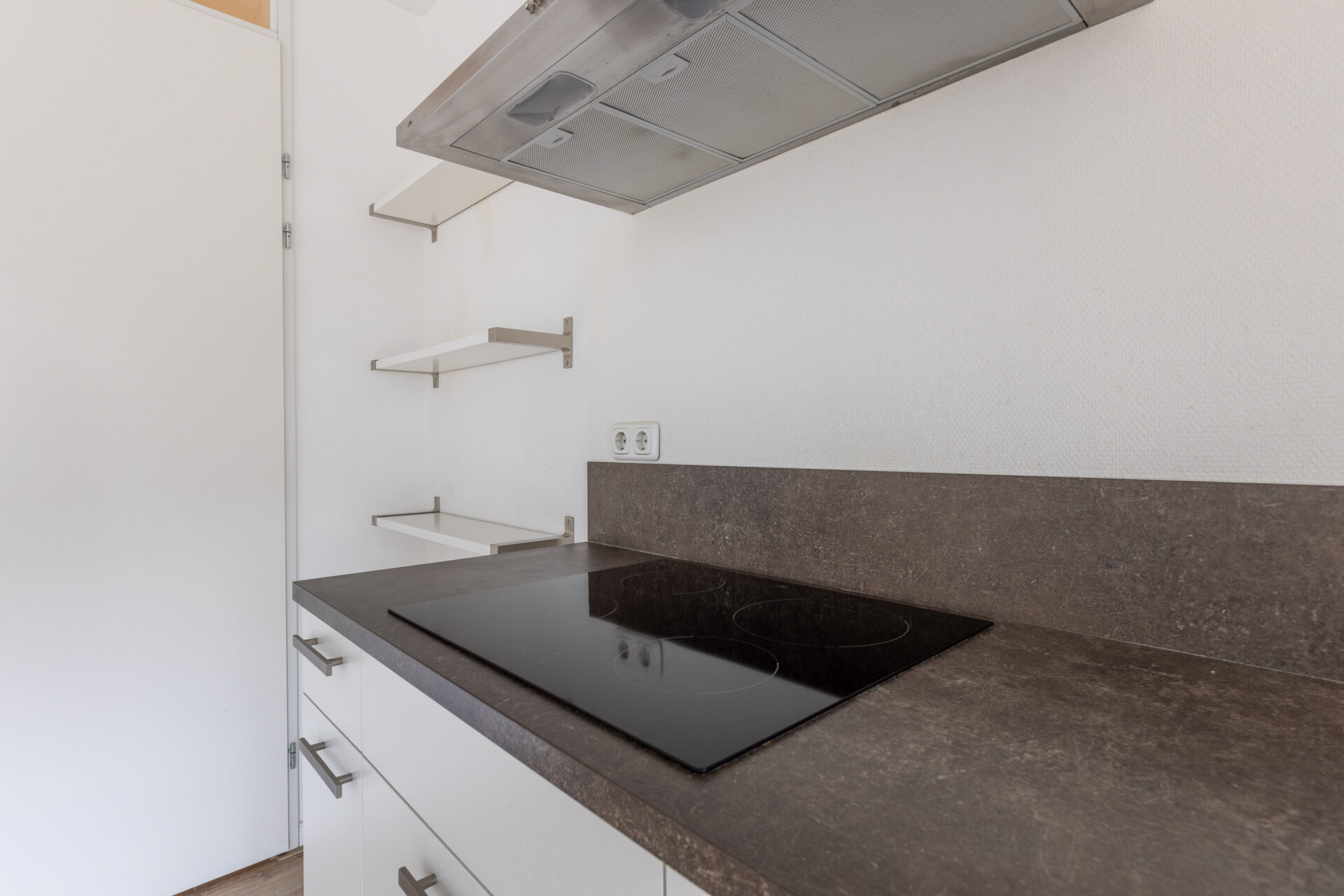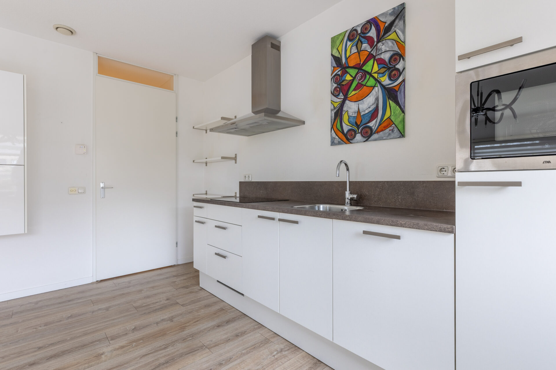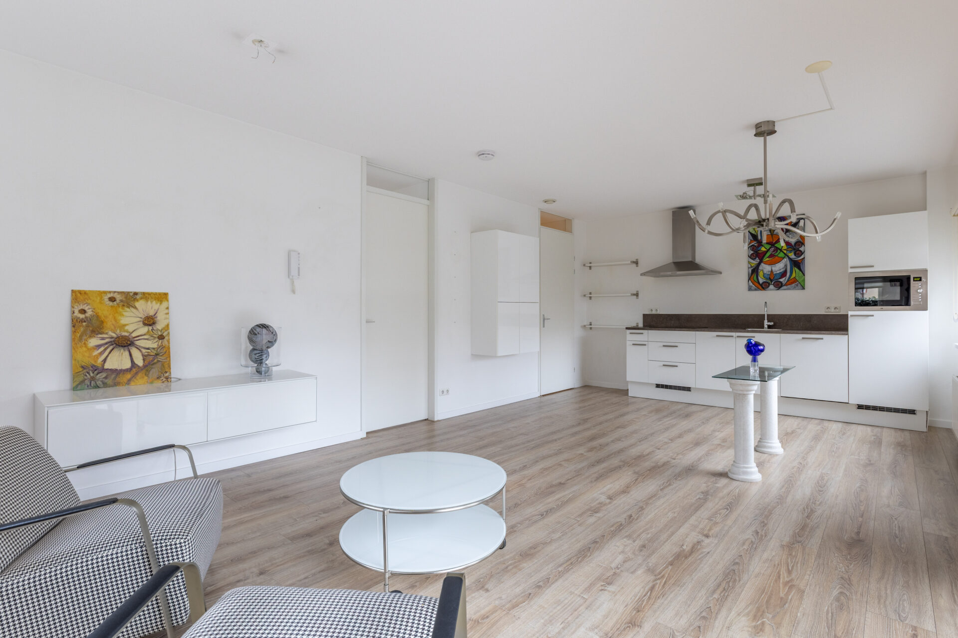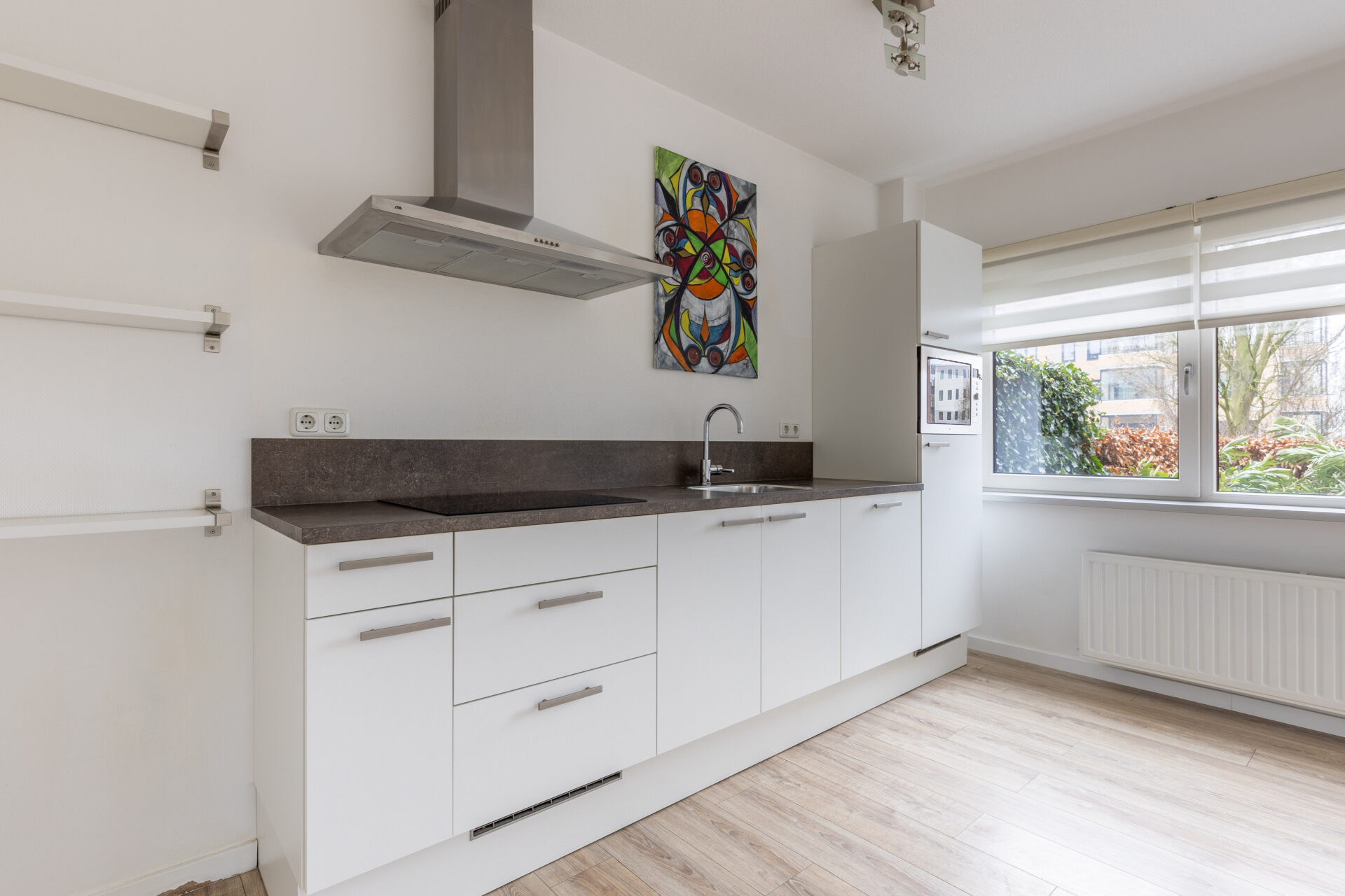 Via de entree bereikt men de lichte woonkamer met open keuken, aan de achterzijde van het appartement. De woonkamer biedt ruimte voor een zit- en een eethoek. De keuken beschikt over een inductiekookplaat met een afzuigkap, een spoelbak, een vaatwasser, een magnetron en een koelkast.
