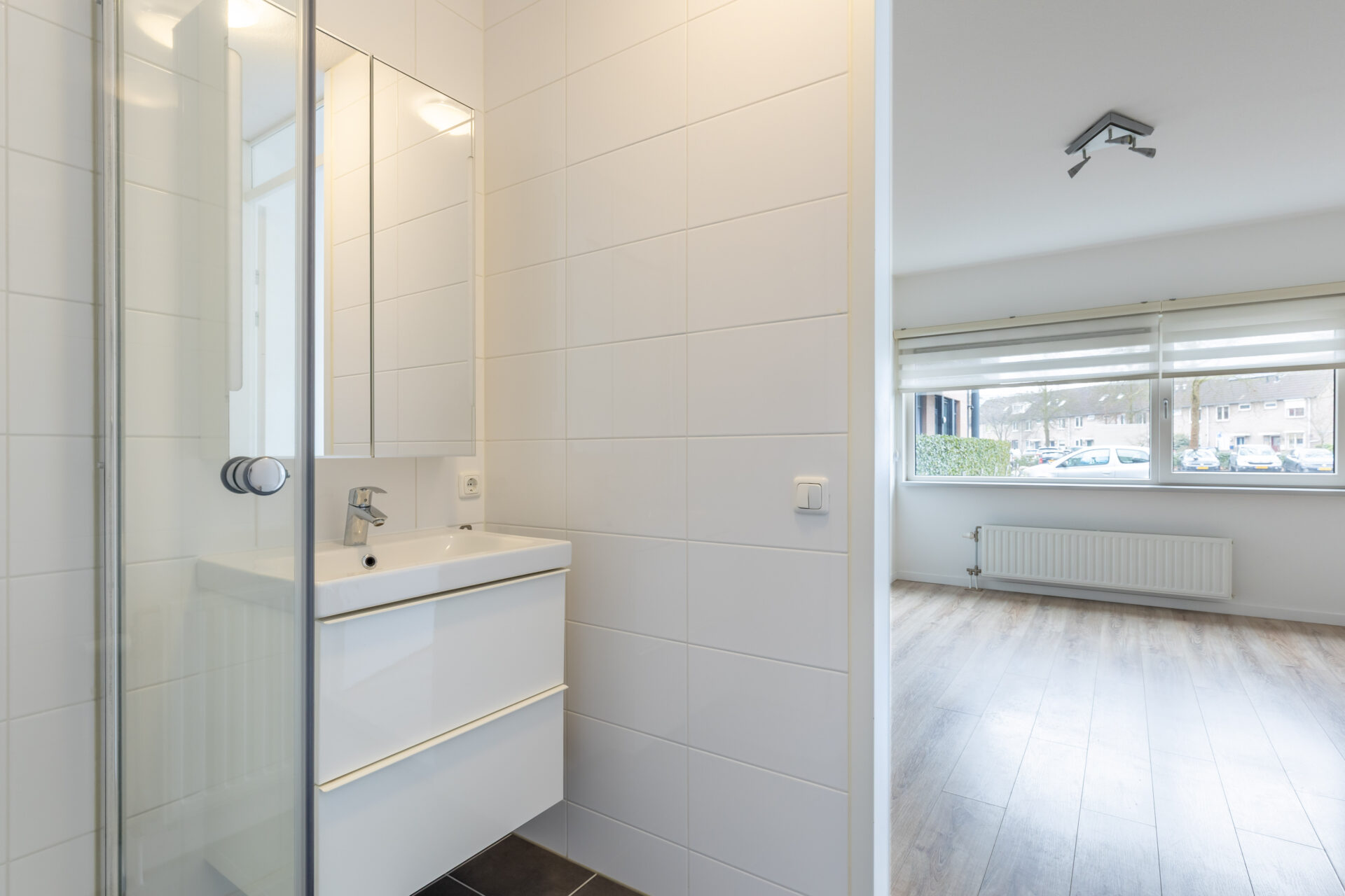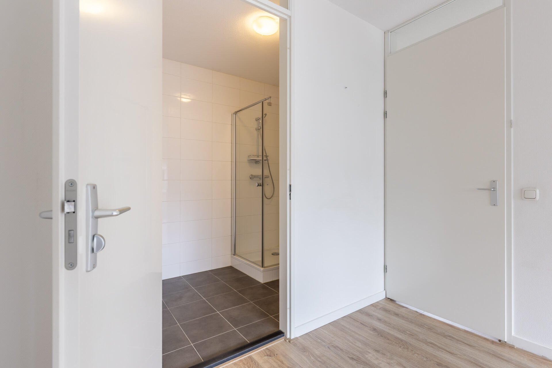 Vanuit de woonkamer bereikt men de ruime slaapkamer met een oppervlakte van circa 13,6 vierkante meter. Aangrenzend bevindt zich de badkamer en suite, welke is uitgerust met een douche en een wastafel. Hier is tevens de wasmachineaansluiting gesitueerd.