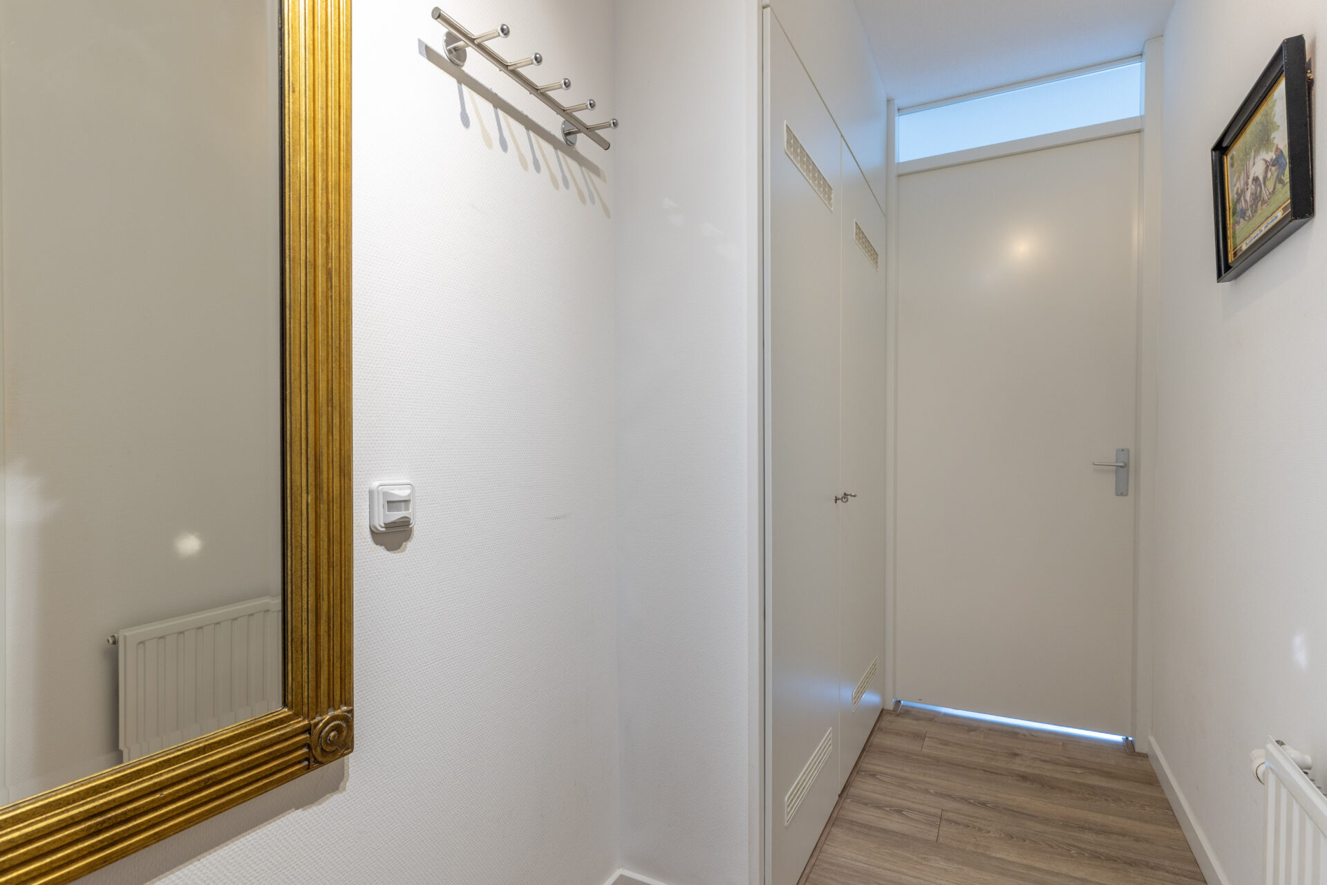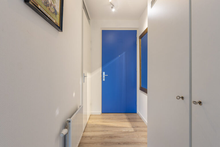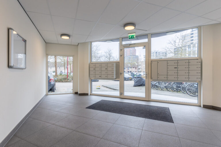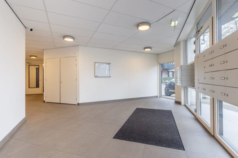 Het appartement is bereikbaar via de gemeenschappelijke entree. De voordeur leidt men naar de entree van het appartement. Hier bevinden zich de meterkast, het toilet met fonteintje en ruimte voor een kapstok en/of schoenenkast.