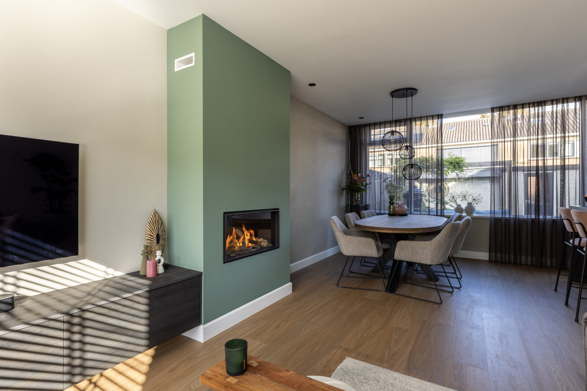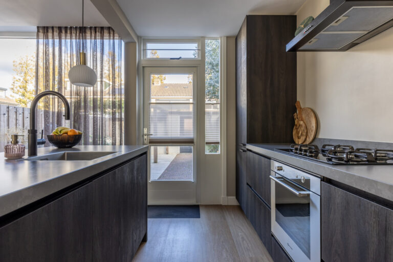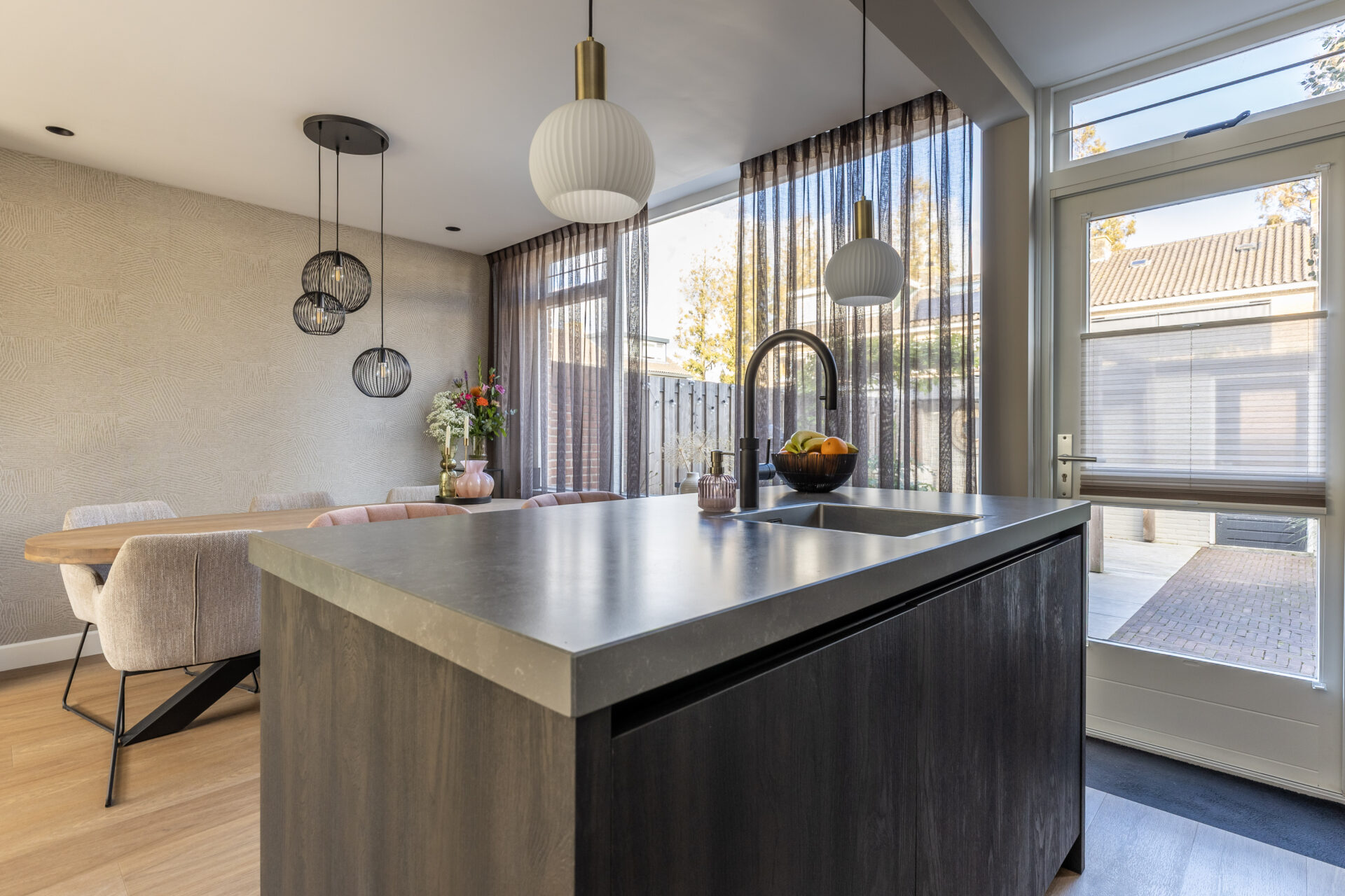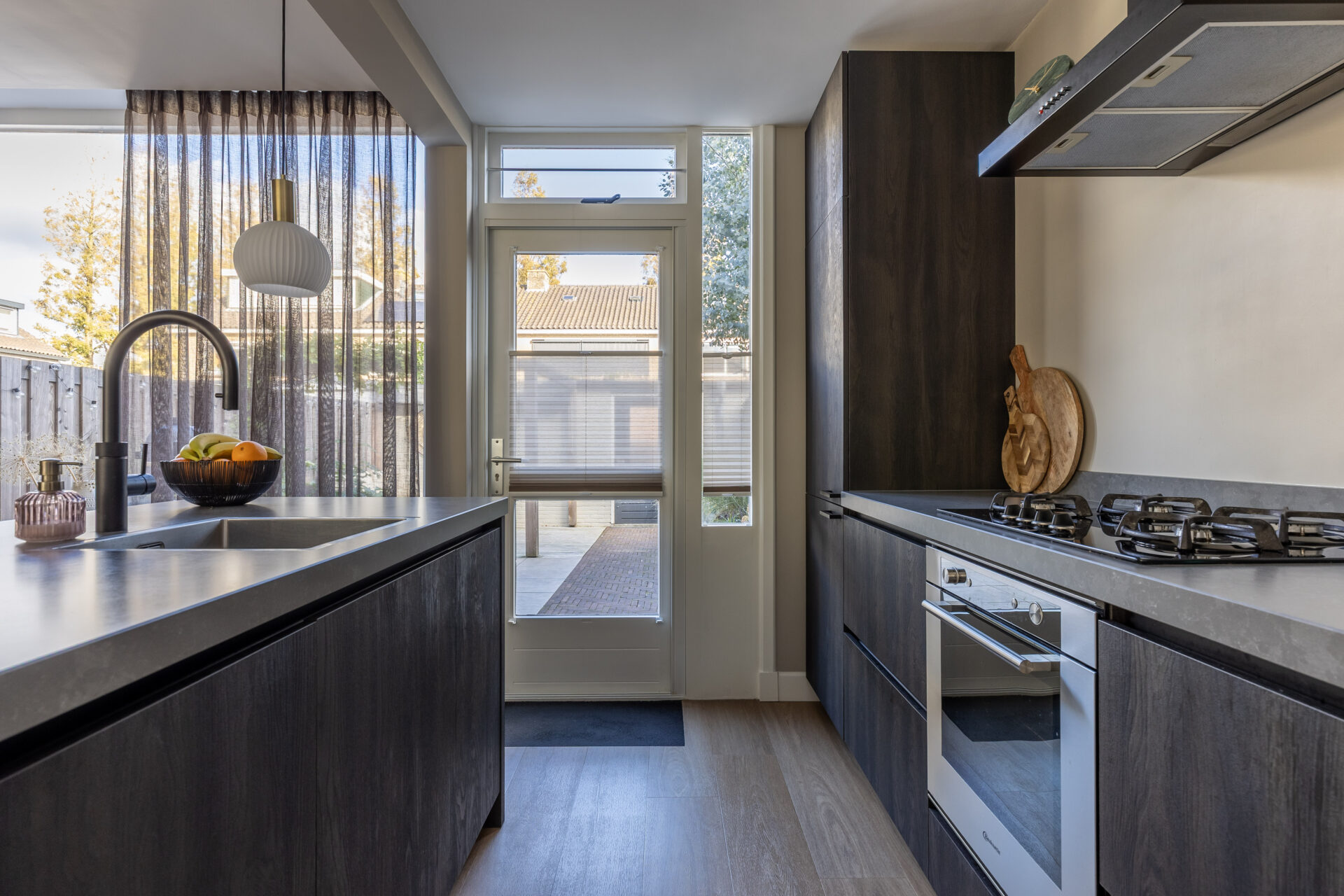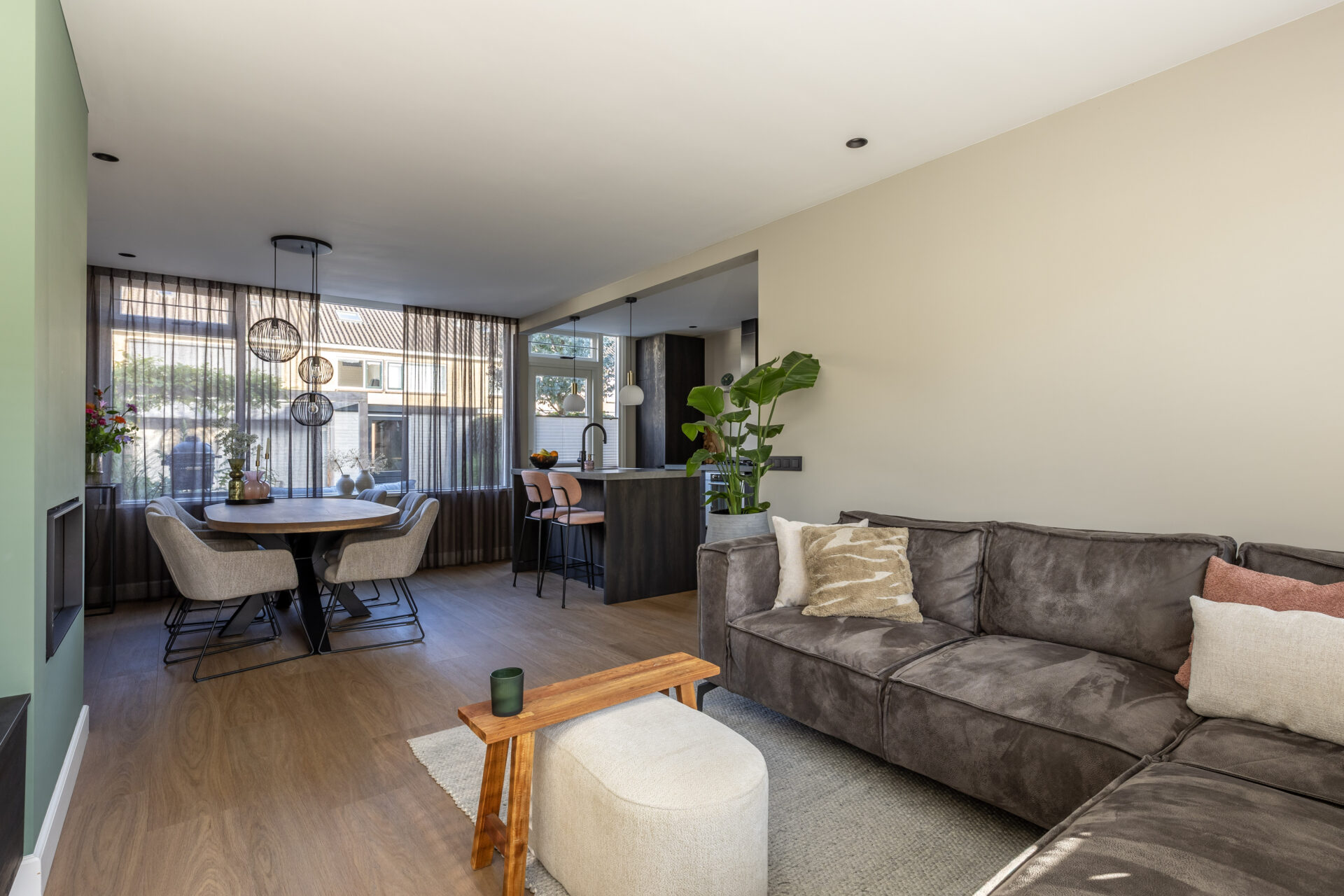 Via de entree bereikt men de woonkamer met open keuken. Door de grote ramen aan zowel de voor- als de achterzijde beschikt deze ruimte over een prettig lichtinval. De zithoek is aan de voorkant van de woning gelegen en beschikt over een sfeervolle gaskachel. Aan de achterzijde van de woning bevindt zich de open keuken met spoeleiland en de eethoek. De keuken is uitgerust met een spoelbak met Quooker, een vaatwasser, een oven, een gasfornuis met afzuigkap en een koel-vriescombinatie. Door de achterdeur in de keuken is de achtertuin gemakkelijk bereikbaar.