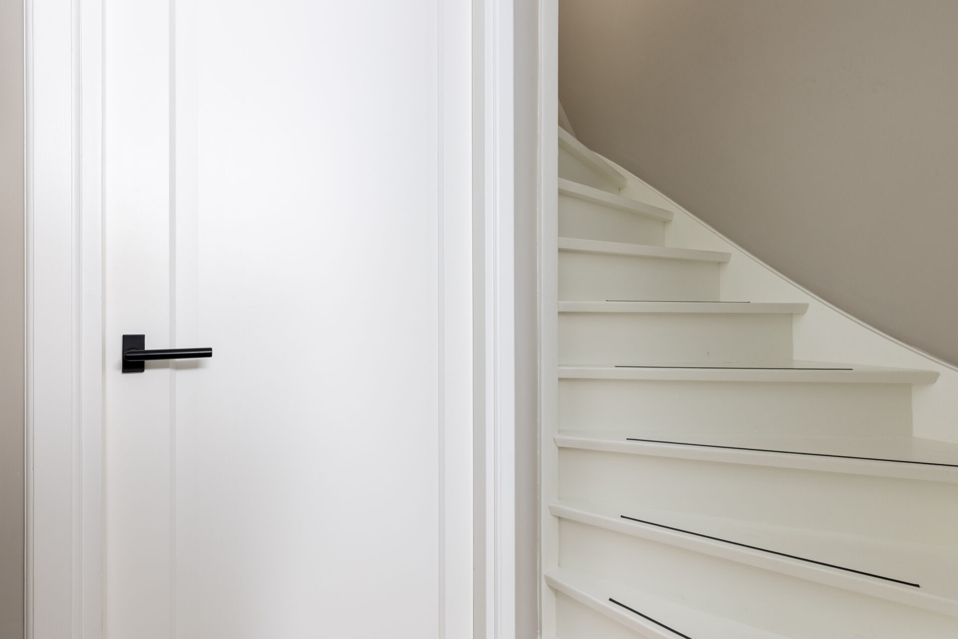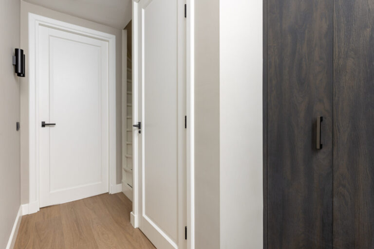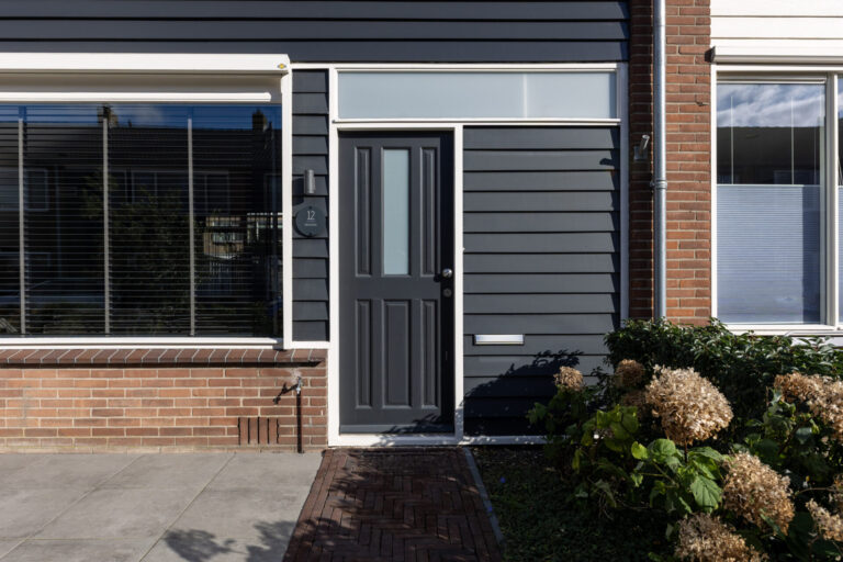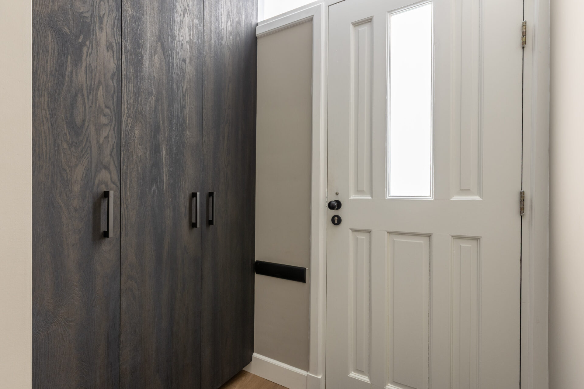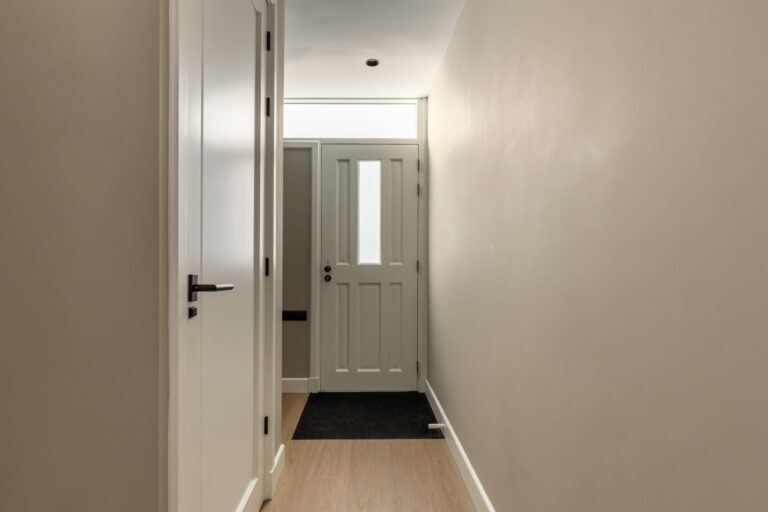 De woning is bereikbaar via de voordeur, welke zich aan de voorzijde van de woning bevindt. Hier bevinden zich de meterkast, het toilet en de trap naar de eerste verdieping. De meterkast en de garderobe zijn verwerkt in een ingebouwde kast.