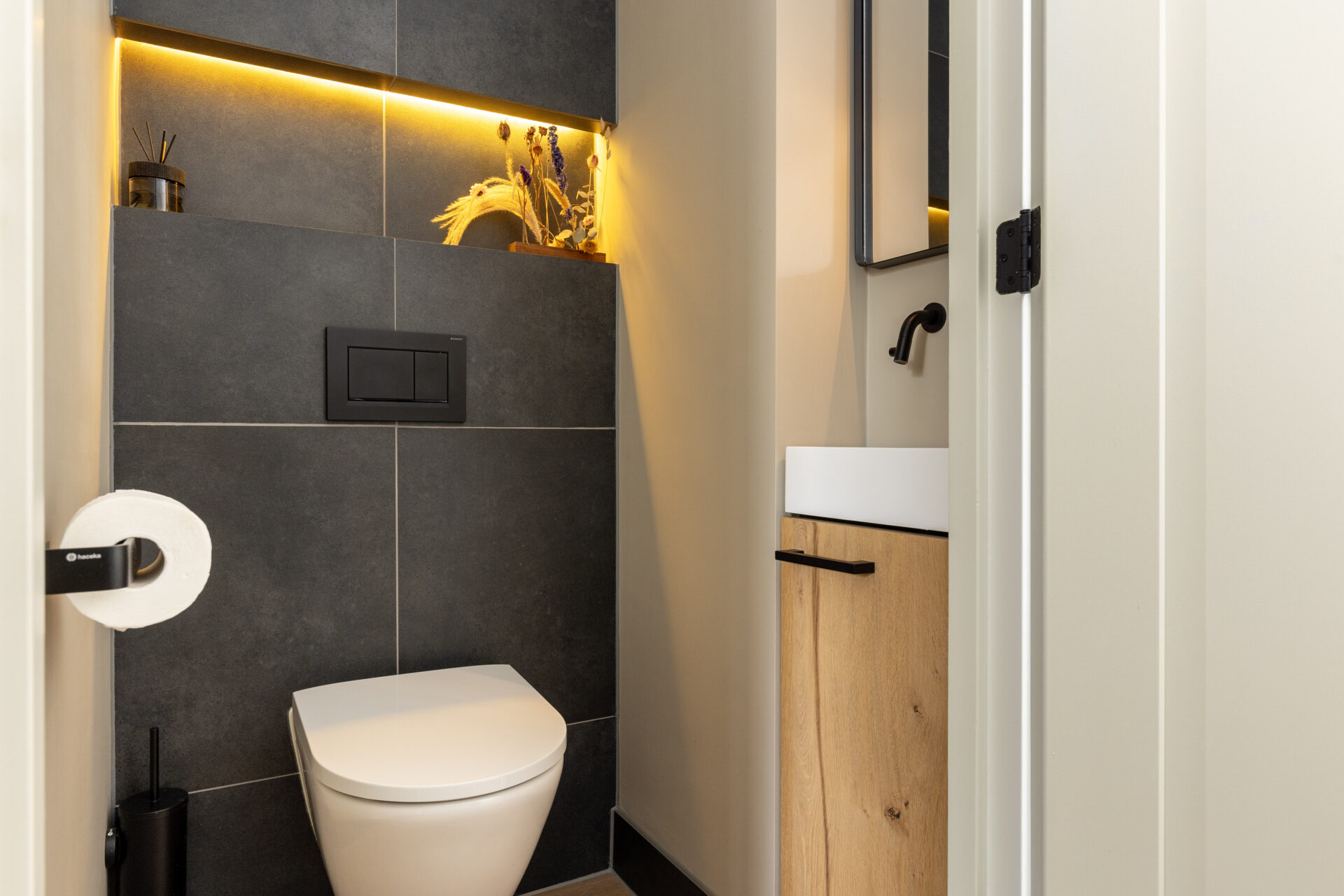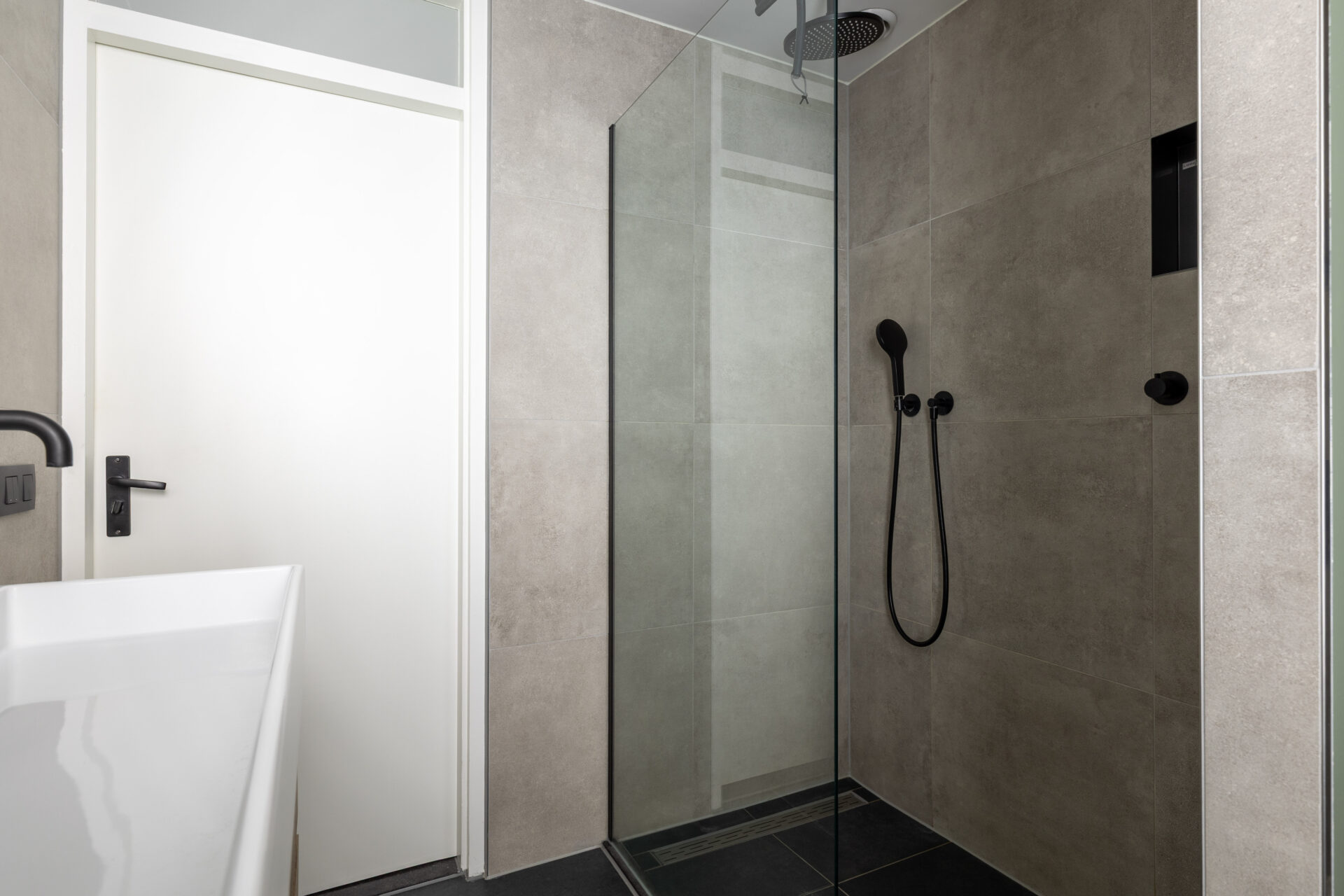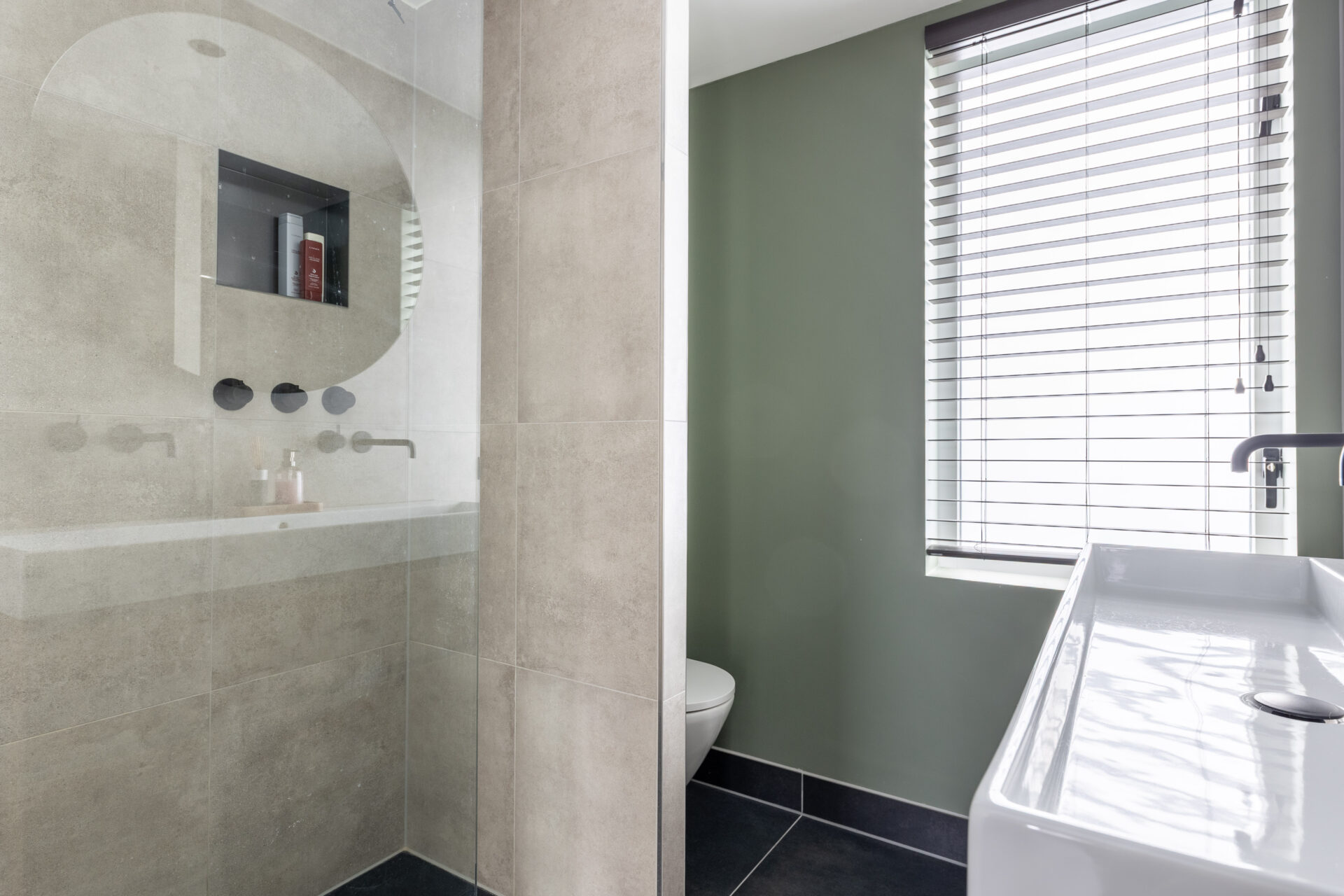 - Badkamer met een inloopdouche, dubbele wastafel en tweede toilet;