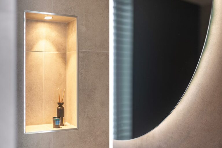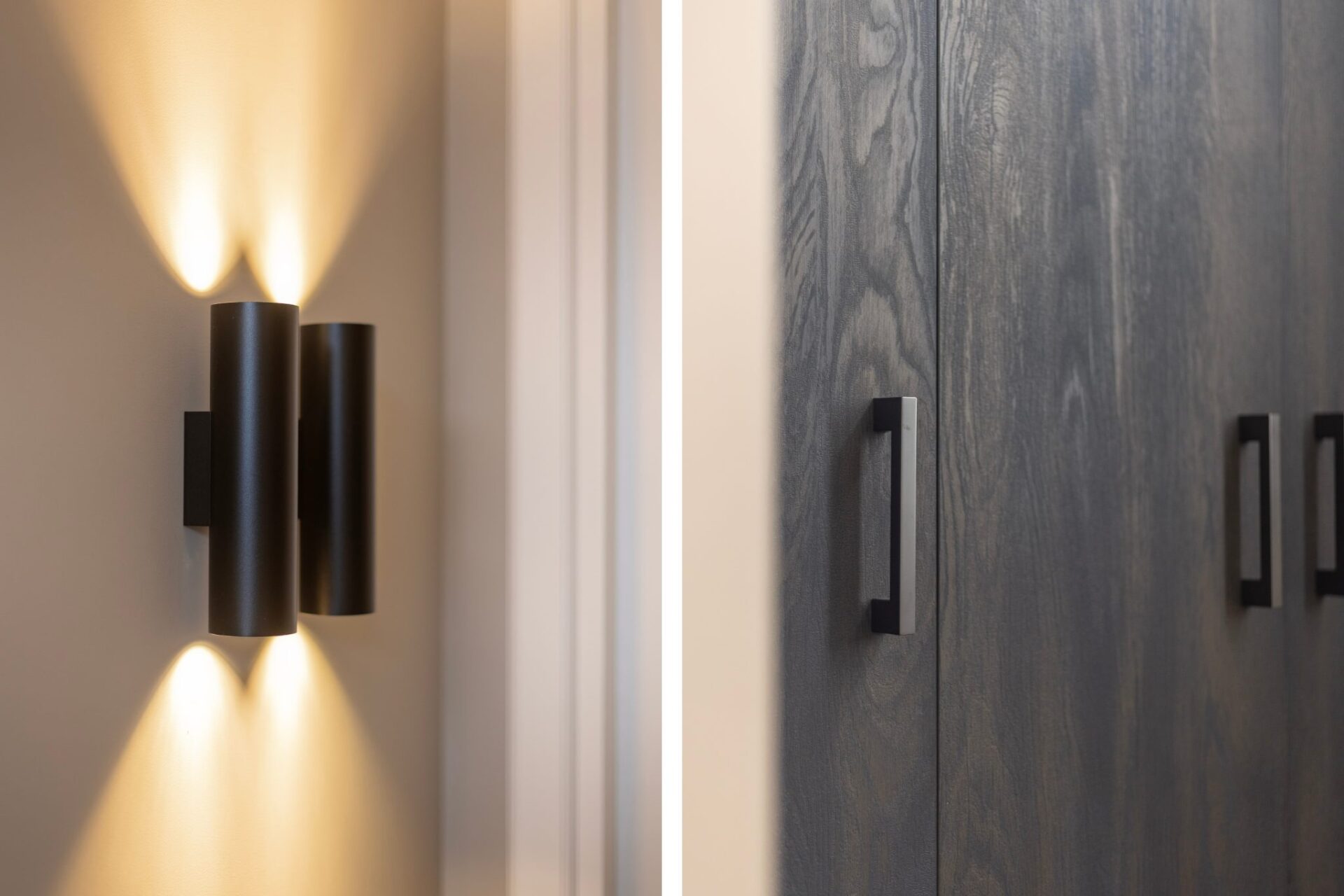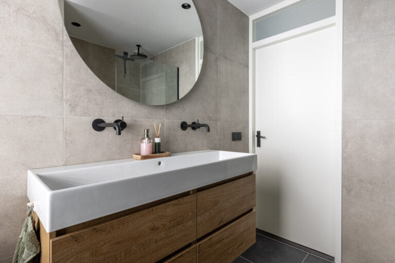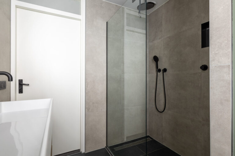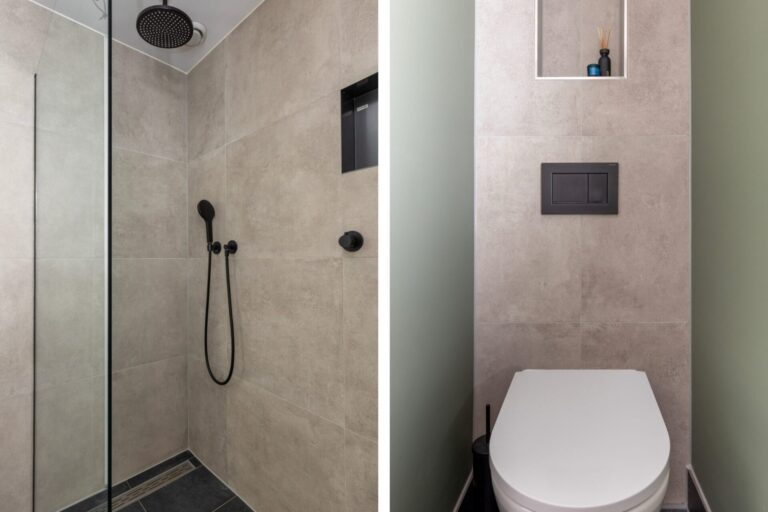 - Badkamer met een inloopdouche, dubbele wastafel en tweede toilet;