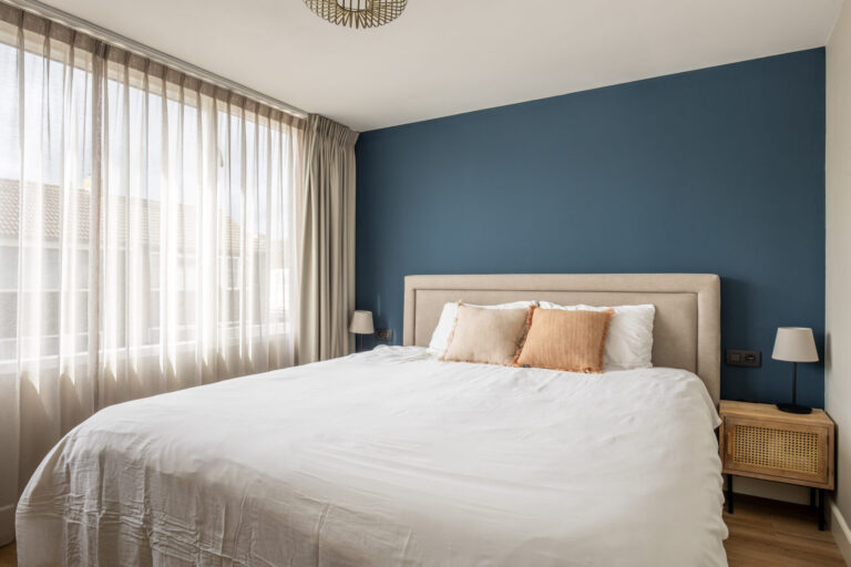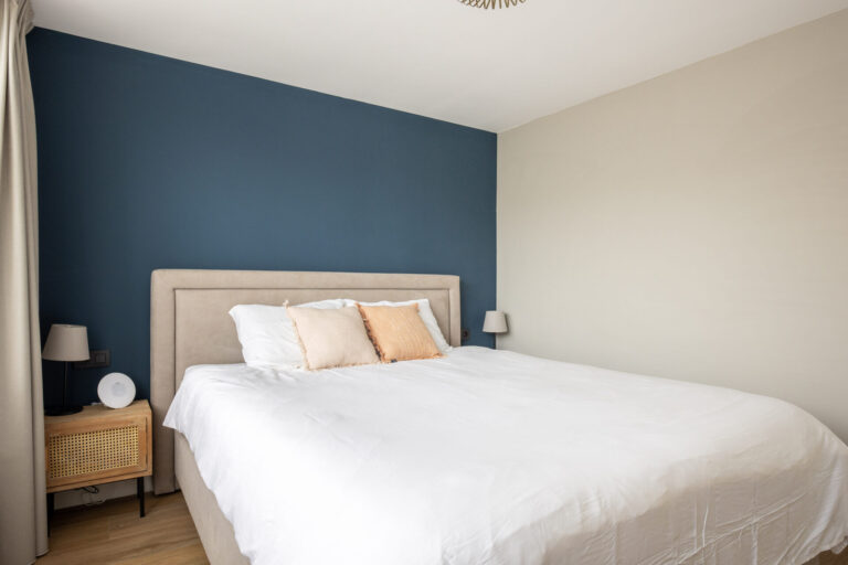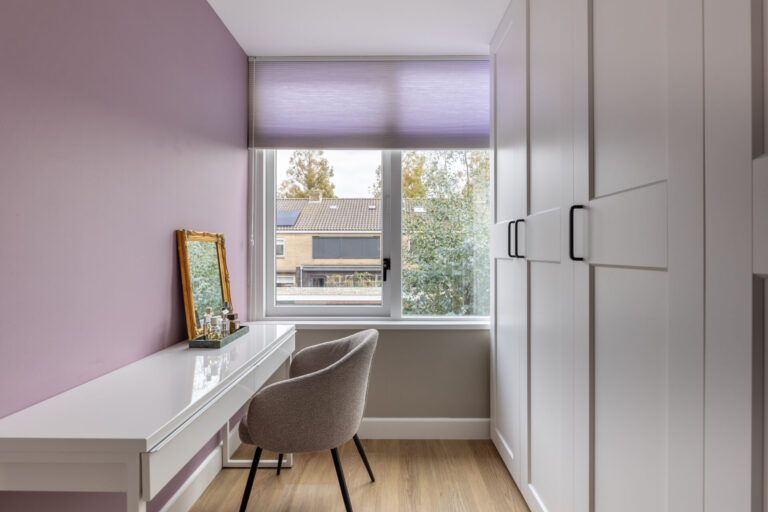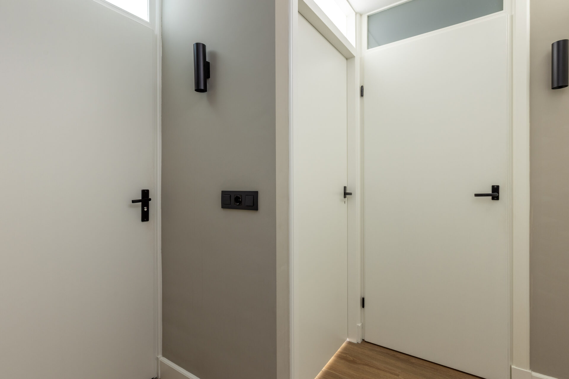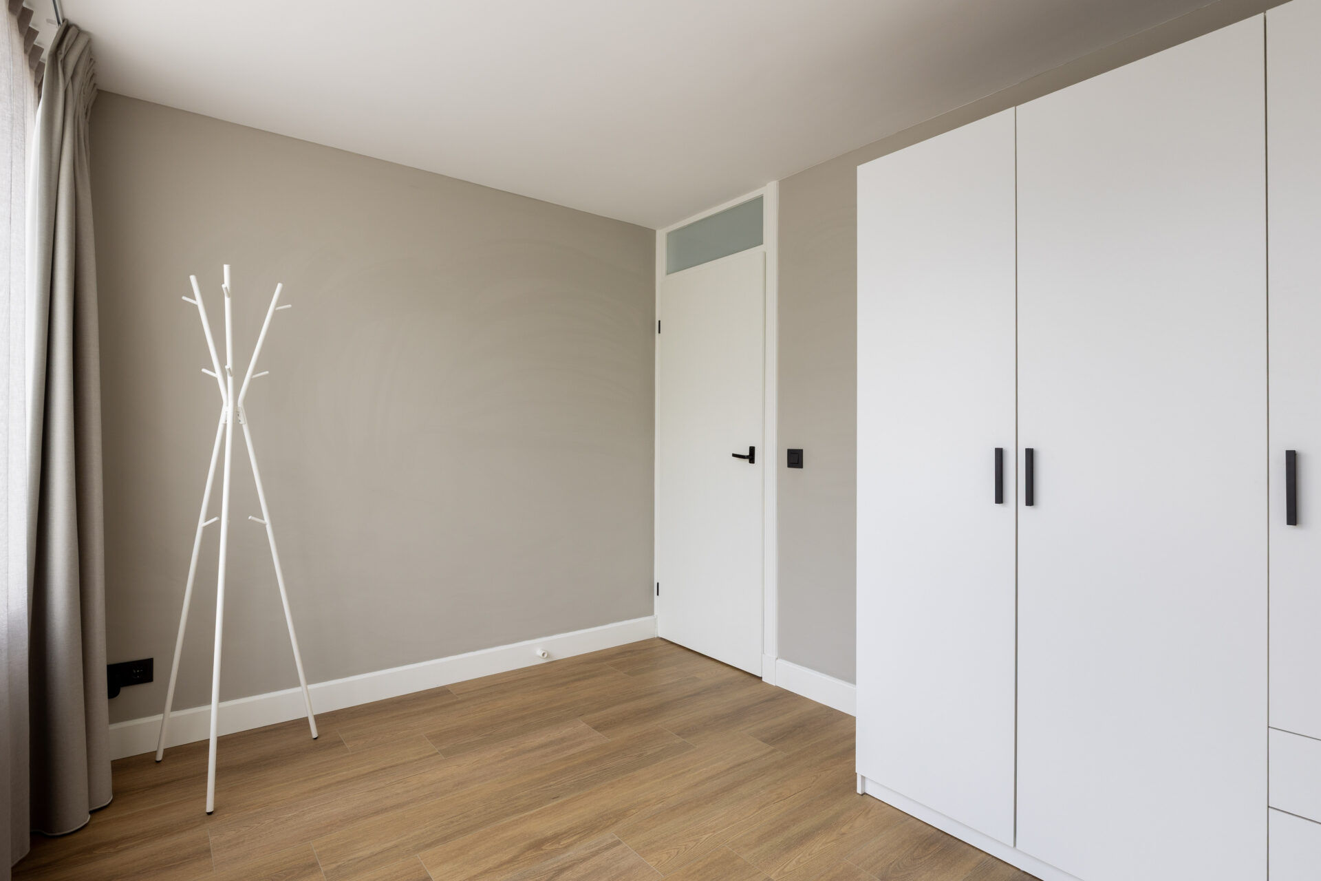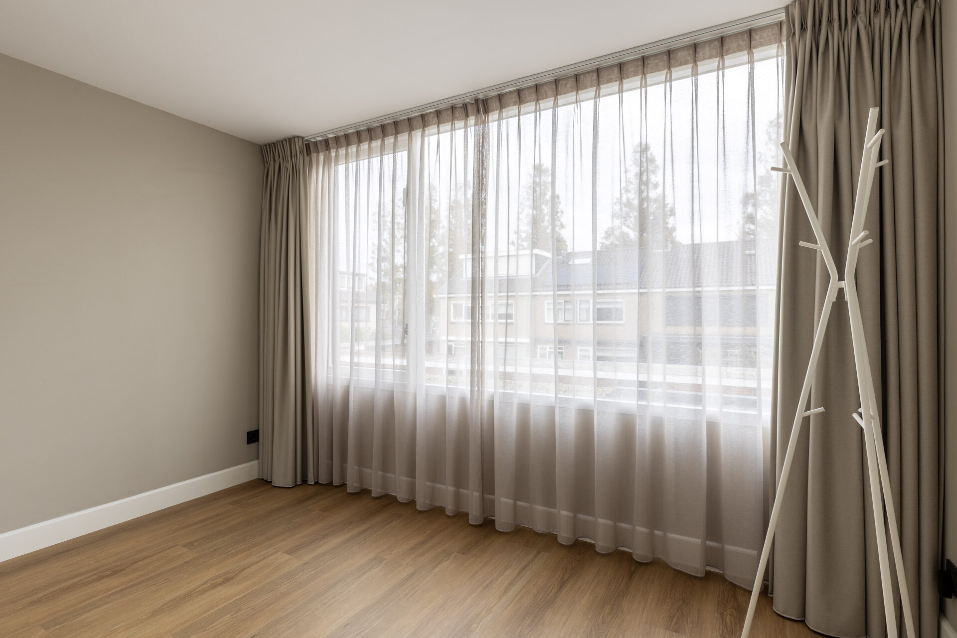 Aan de achterzijde van de woning zijn nog eens twee slaapkamers gelegen, met een oppervlakte van circa 9,6 en 5,7 vierkante meter. In het midden van de verdieping is een afgesloten wasruimte gecreëerd.