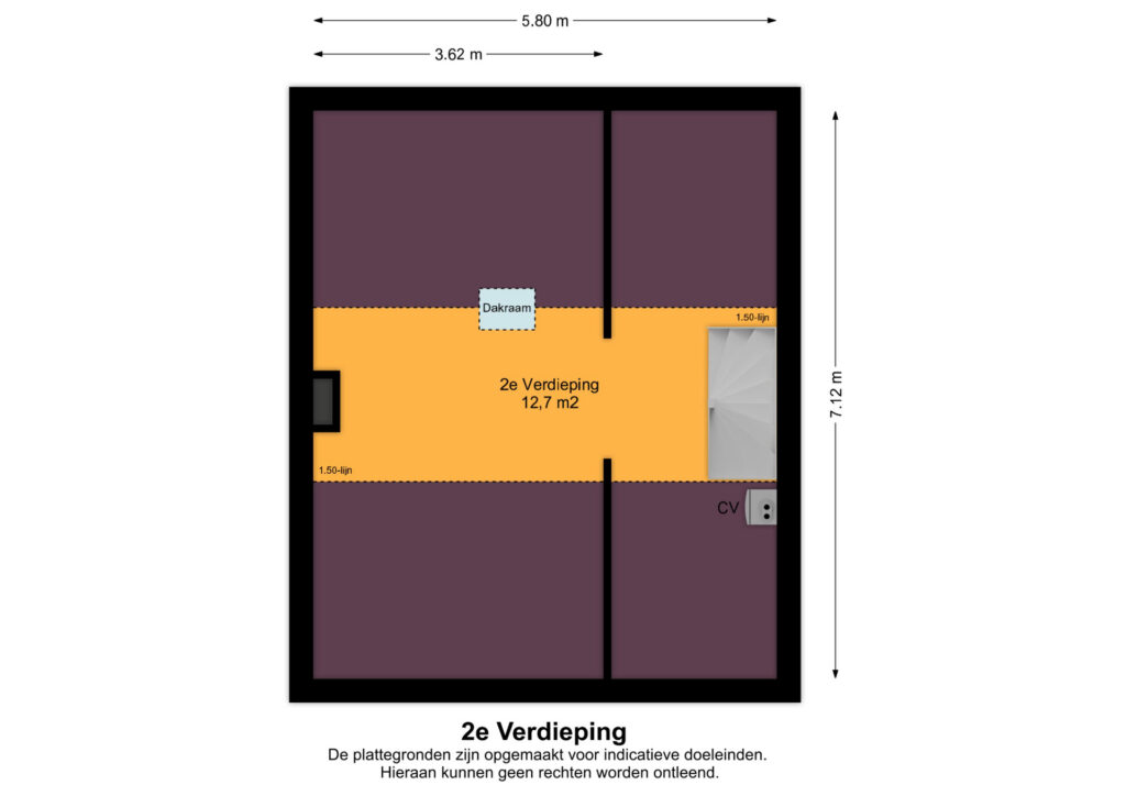 De tweede verdieping is bereikbaar via een vaste trap. Deze verdieping is momenteel een open ruimte met een oppervlakte van circa 12,7 vierkante meter. Deze is nog volledig naar eigen wens in te richten. Hier bevindt zich de cv-ketel.