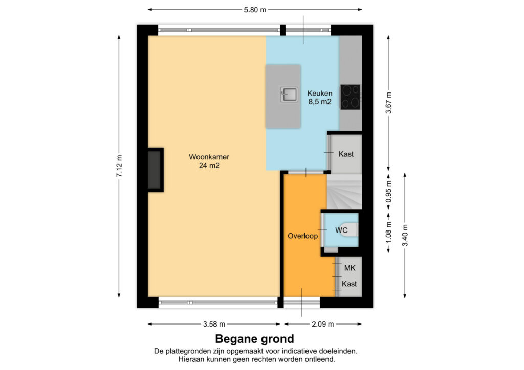*De verstrekte informatie is met de nodige zorgvuldigheid samengesteld. Onzerzijds wordt echter geen enkele aansprakelijkheid aanvaard voor enige onvolledigheid, onjuistheid of anderszins, dan wel de gevolgen daarvan. Alle opgegeven maten en oppervlakten zijn indicatief.”