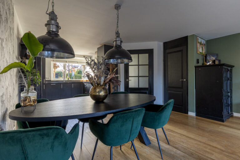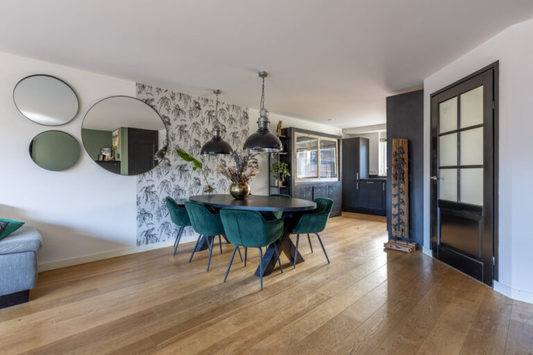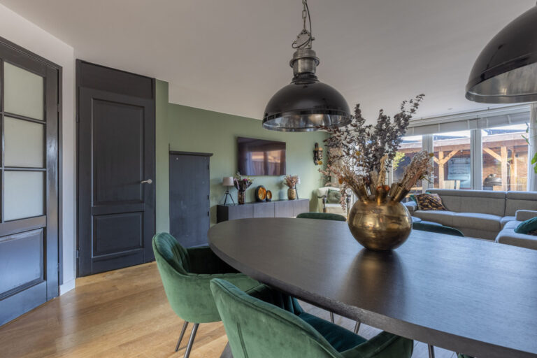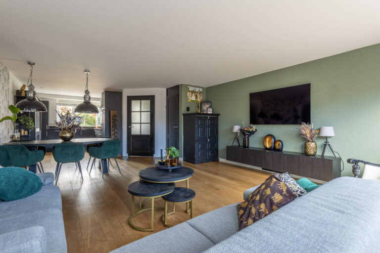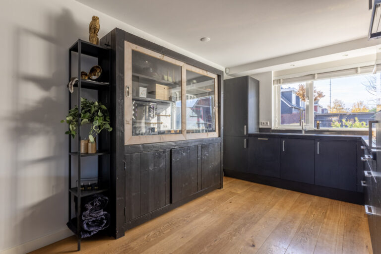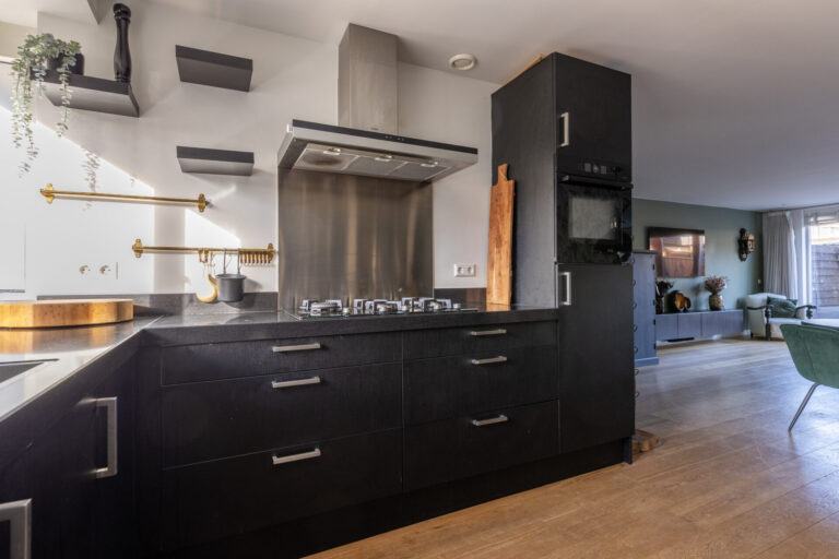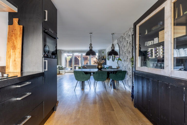 Tussen de keuken en de woonkamer is voldoende ruimte aanwezig voor een prettige eethoek. De trapkast zorgt voor extra bergruimte.