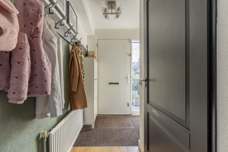 Via de voortuin bereikt men de voordeur van de woning. Deze geeft toegang tot de entree. Hier bevinden zich het toilet met fonteintje, de meterkast en ruimte voor een kapstok en schoenenkast. Tevens is hier de trap naar de eerste verdieping gesitueerd.
