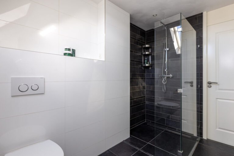 Naast de grootste slaapkamer is de badkamer gelegen. Deze is uitgerust met een inloopdouche, een wastafelmeubel en een tweede toilet.