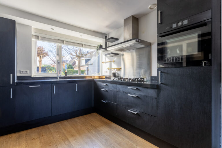 Vanuit de entree is de woonkamer met open keuken bereikbaar. De riante zithoek is gesitueerd aan de achterzijde van de woning. De moderne open keuken bevindt zich aan de voorzijde van de woning. Deze beschikt over een gasfornuis met afzuigkap, een combi-oven, een spoelbak, een vaatwasser en een koel-vriescombinatie.