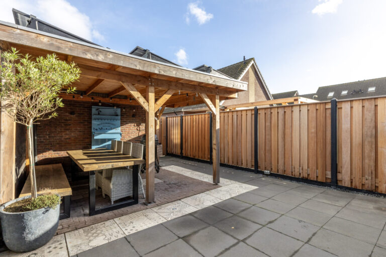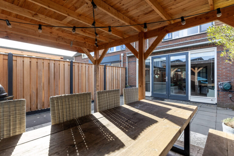 De woning beschikt over een voor- en achtertuin. De voortuin biedt de mogelijkheid voor een zonnig zitje vanwege de zuidwestelijke ligging. De achtertuin is gelegen op het noordoosten en is bereikbaar via de openslaande deuren in de woonkamer én via achterom. In de achtertuin is een ruime berging van circa 7 vierkante meter en een riante overkapping (gebouwd in 2024) gelegen. Het brede uitvalscherm biedt de mogelijkheid om extra schaduwplekken te realiseren.