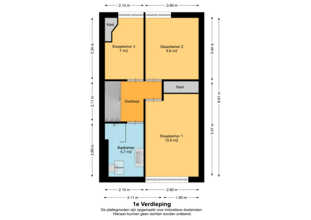- Drie slaapkamers op de eerste verdieping aanwezig (13,9; 9,6 en 7 vierkante meter);