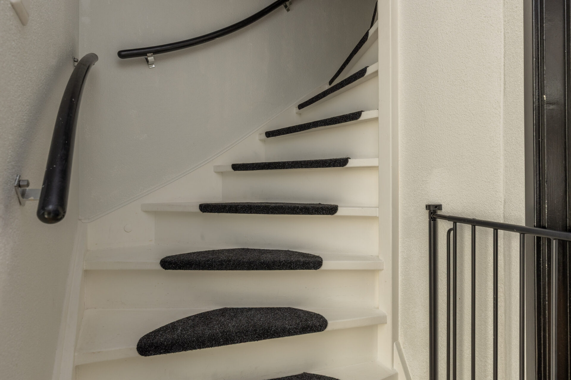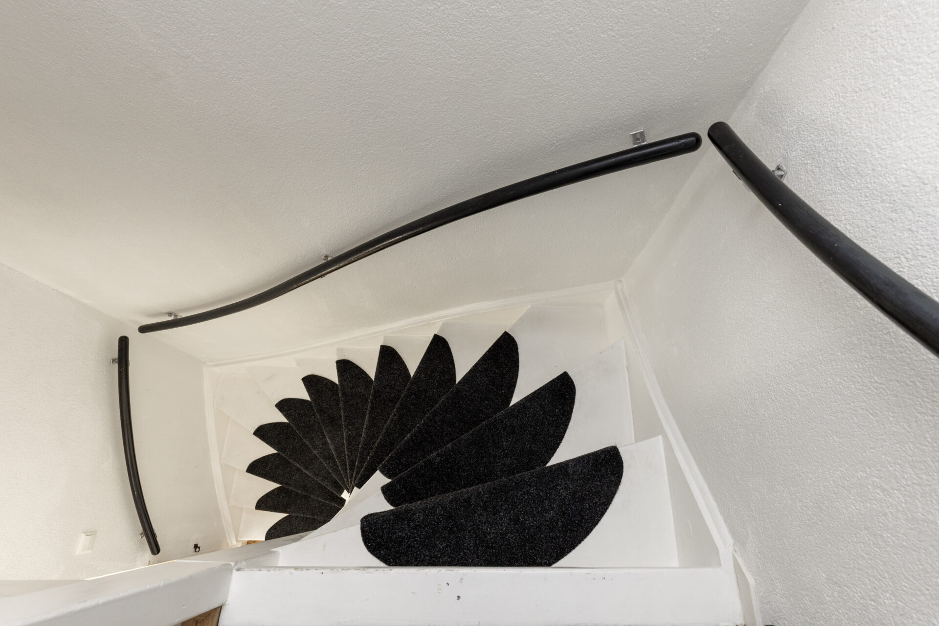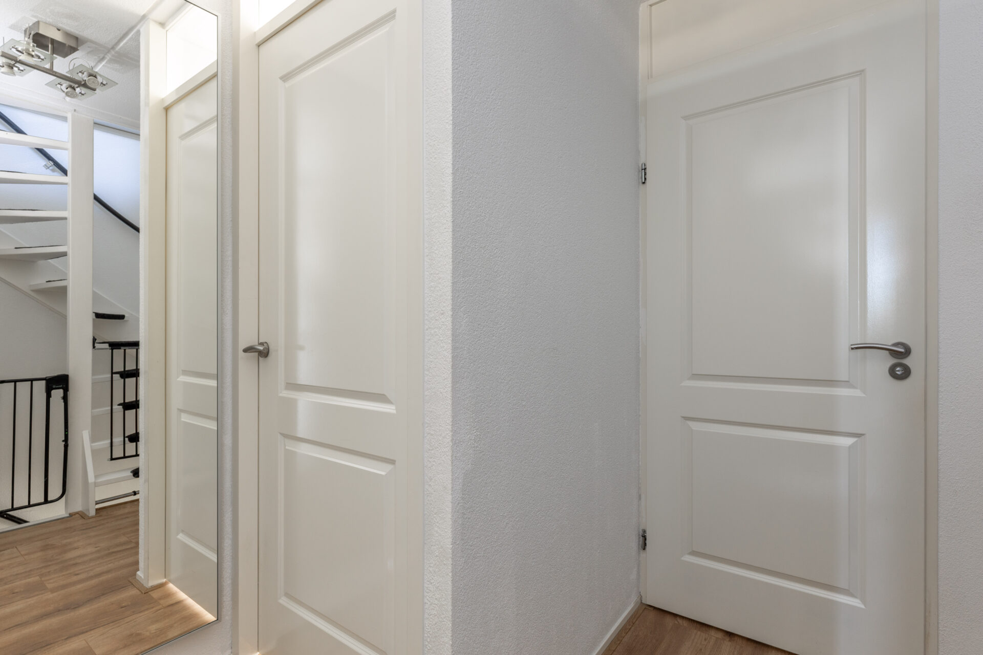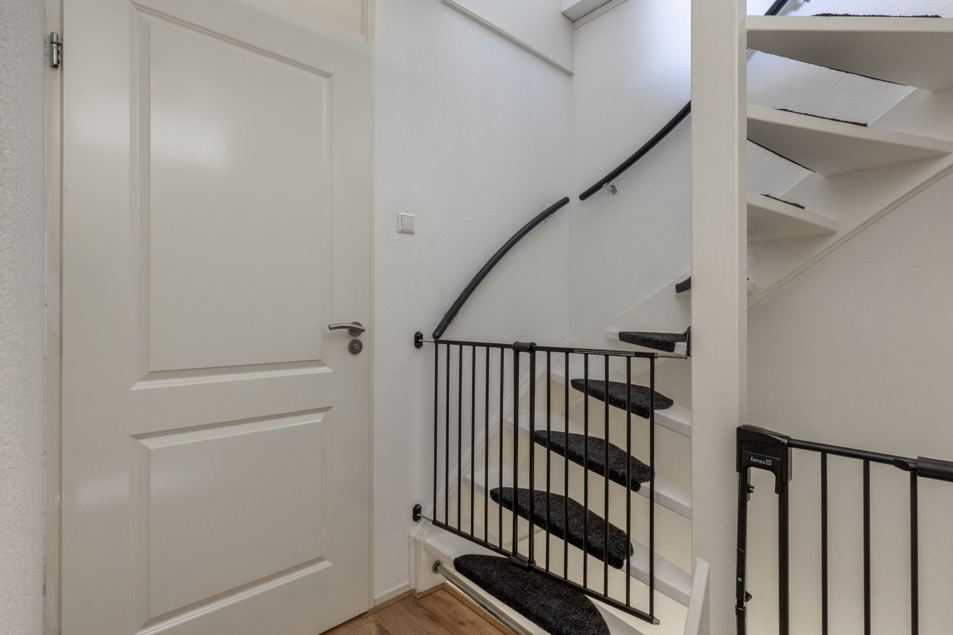 De trap in de entree biedt toegang tot de eerste verdieping. Hier bevinden zich drie slaapkamers en een badkamer.