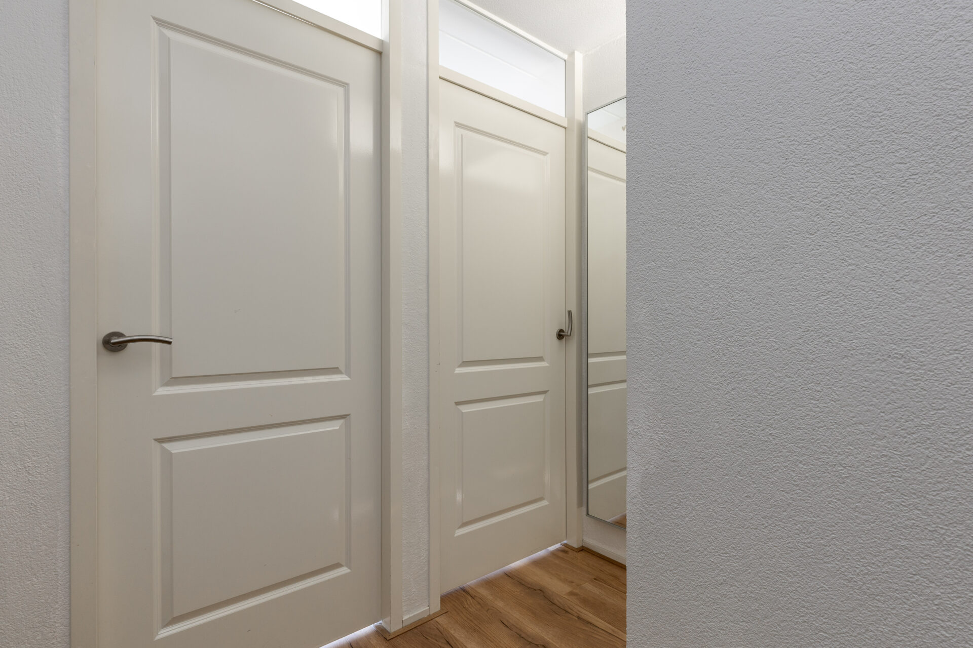 De slaapkamers en de overloop beschikken over een laminaatvloer. In de badkamer is een tegelvloer met vloerverwarming aanwezig.